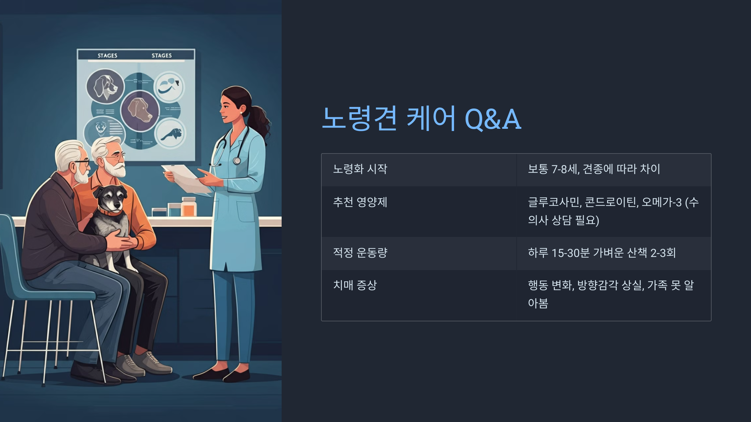 여러분, 강아지의 노령화는 피할 수 없지만, 그 과정을 어떻게 보내느냐는 우리의 손에 달려있습니다. 지금 당장 여러분의 반려견 나이에 맞는 관리를 시작해보는 건 어떨까요? 규칙적인 운동, 균형 잡힌 영양 관리, 정기적인 건강검진, 그리고 무엇보다 변함없는 사랑과 관심. 이것들이 바로 행복한 노년의 비결입니다.