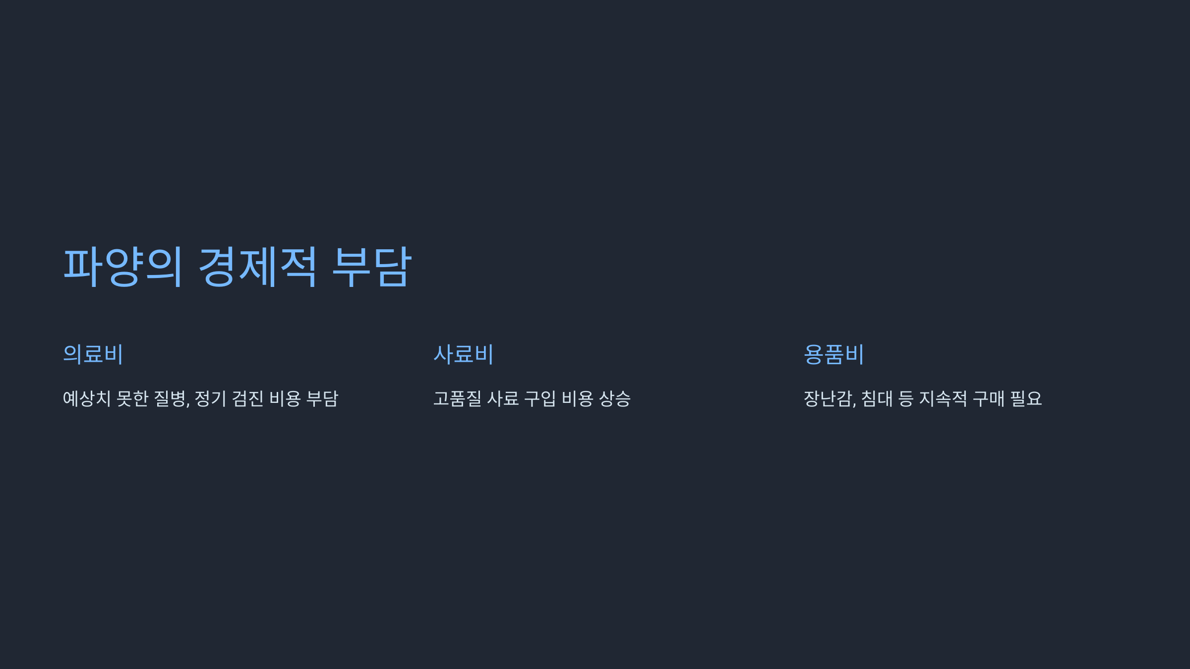 - 사료와 용품 비용: 고품질의 사료와 다양한 용품 구입에 드는 비용이 만만치 않습니다.