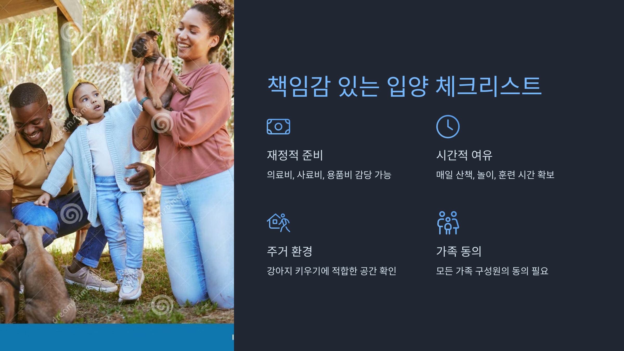 - 모든 가족 구성원이 강아지 입양에 동의하나요?