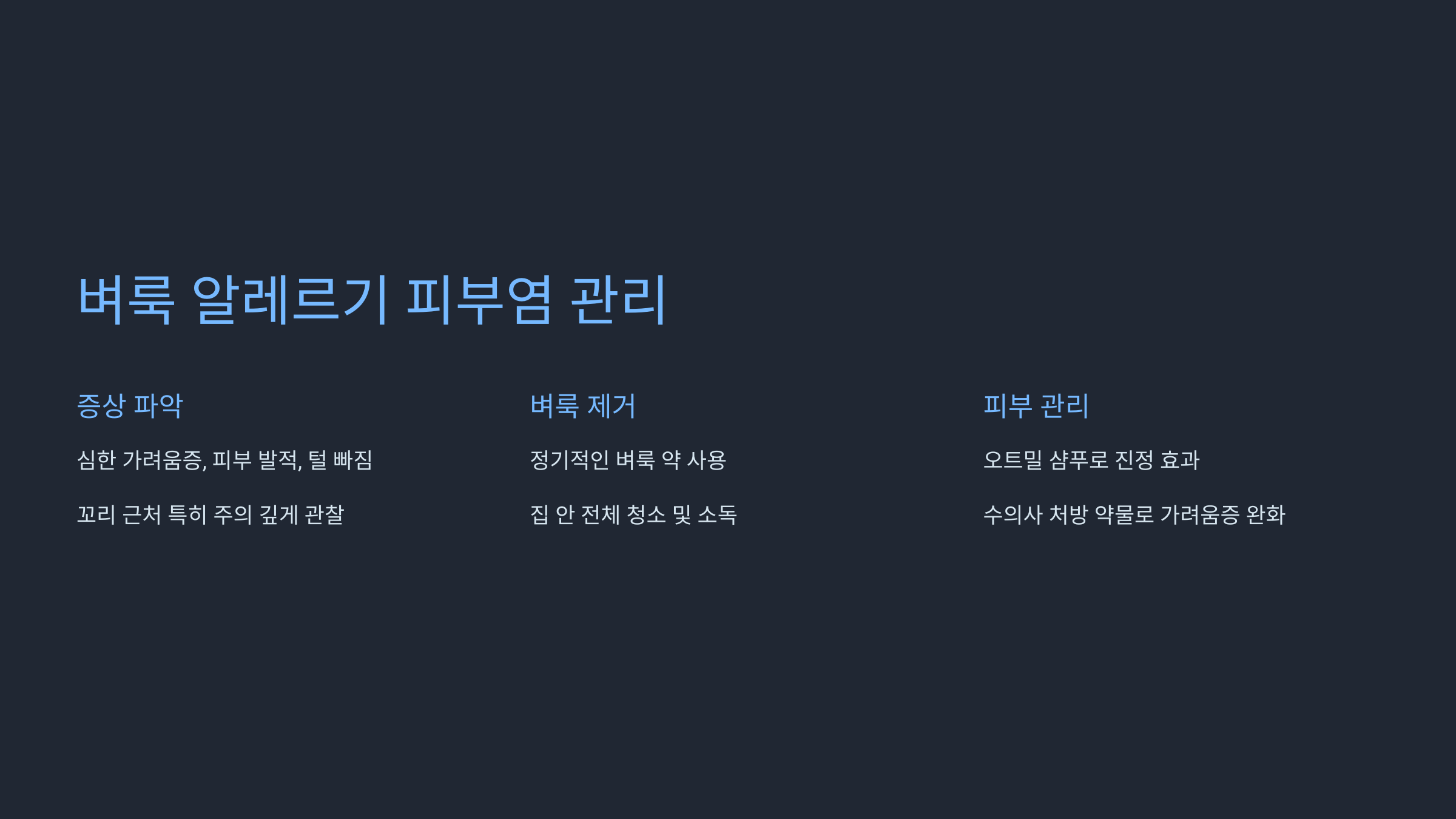 - 수의사 처방에 따른 항히스타민제 또는 스테로이드 사용