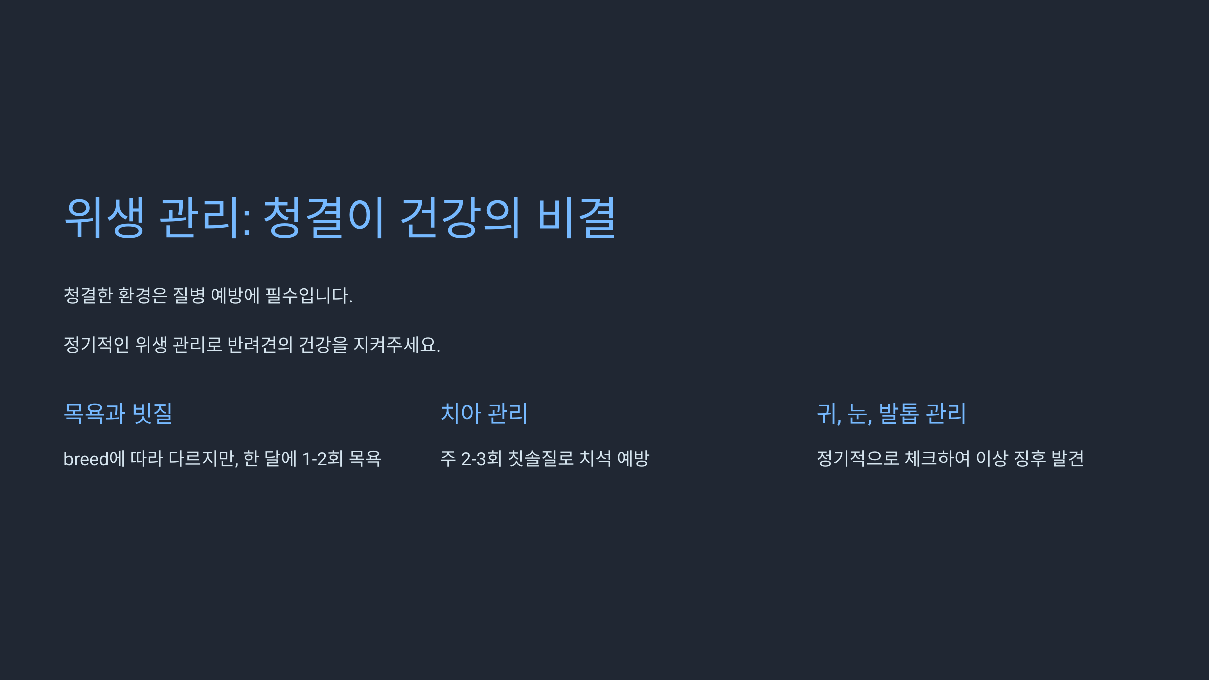 - 정기적인 목욕과 빗질: breed에 따라 다르지만, 보통 한 달에 1-2회 목욕이 적당합니다.