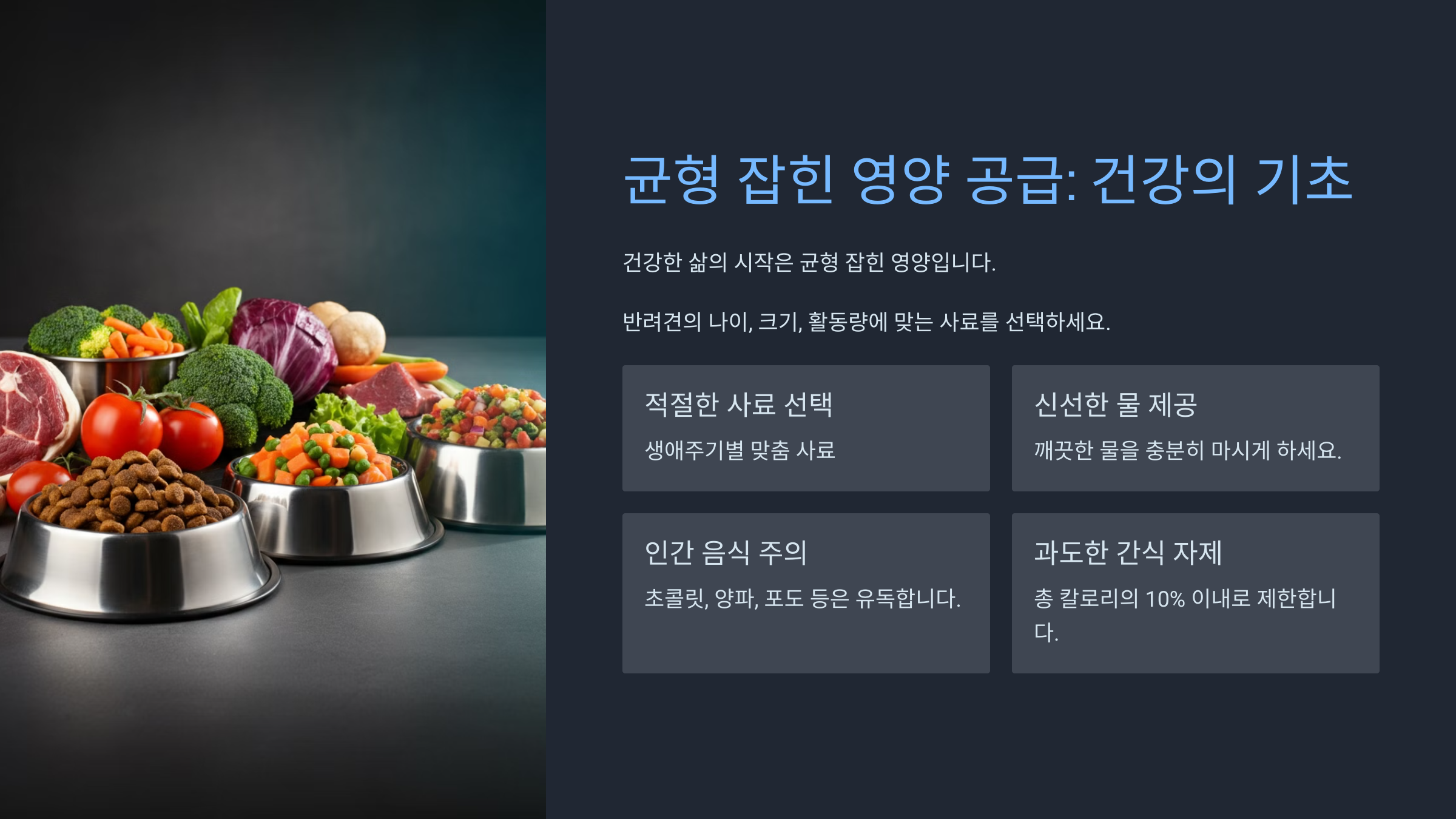 개의 건강 유지를 위해 가장 기본이 되는 것은 균형 잡힌 영양 공급입니다. 적절한 영양 섭취는 질병 예방과 건강한 삶의 핵심입니다.