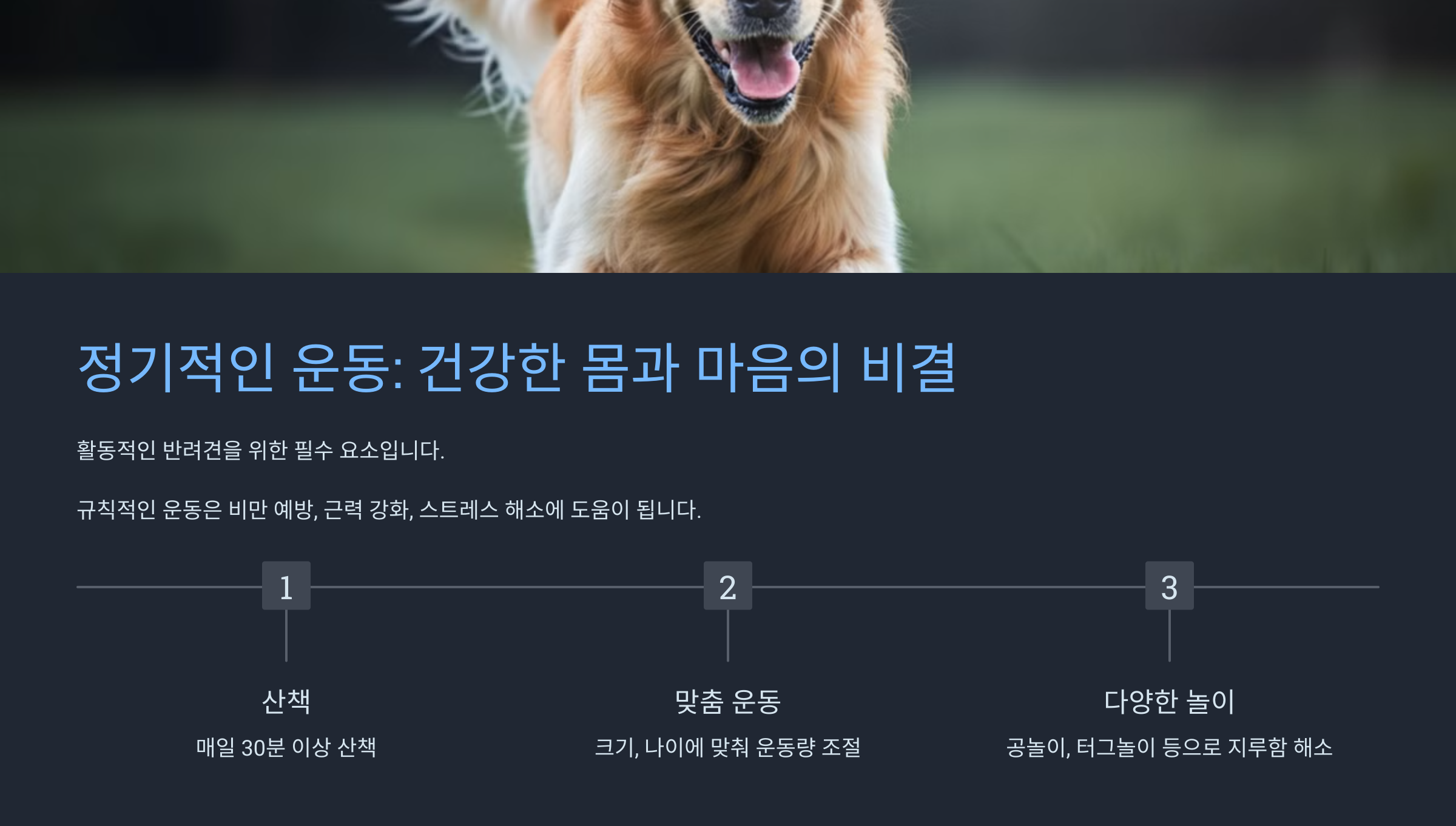 적절한 운동은 개의 신체적, 정신적 건강에 매우 중요합니다. 규칙적인 운동은 비만 예방, 근력 강화, 스트레스 해소에 도움이 됩니다.