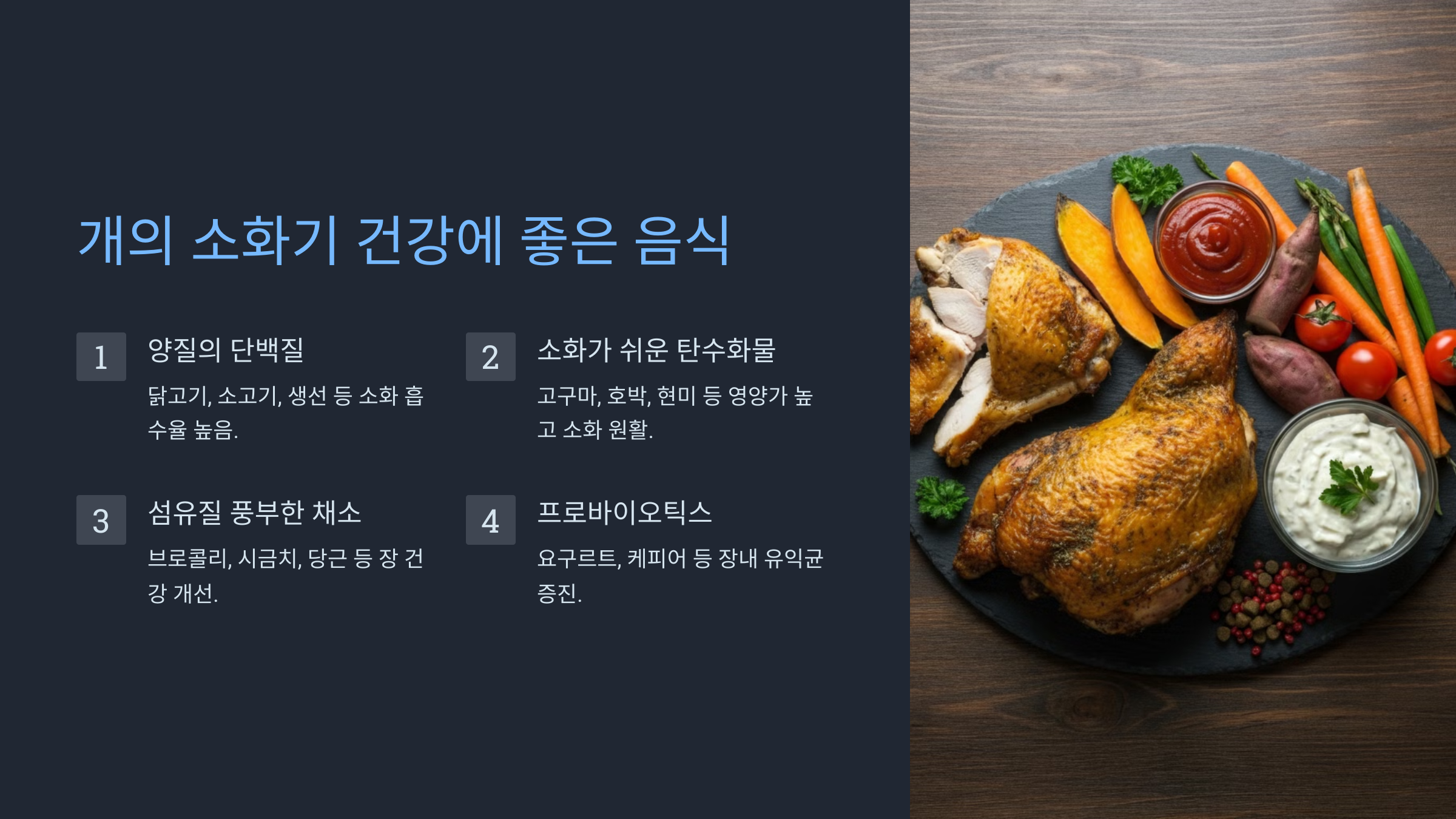 개의 소화기 건강을 위해서는 다음과 같은 음식들이 도움이 됩니다: