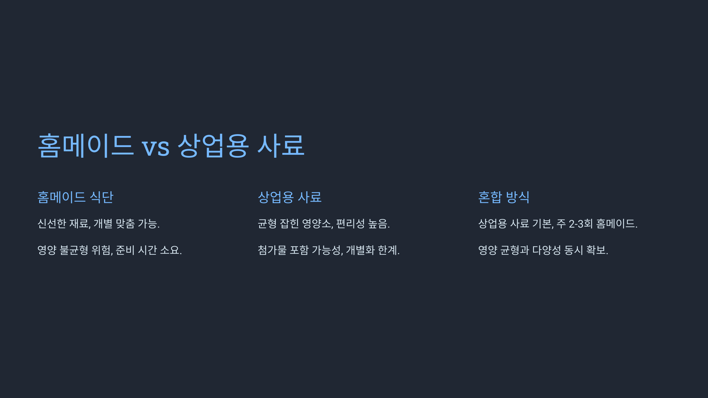 - 단점: 첨가물 포함 가능성, 개별 맞춤의 한계