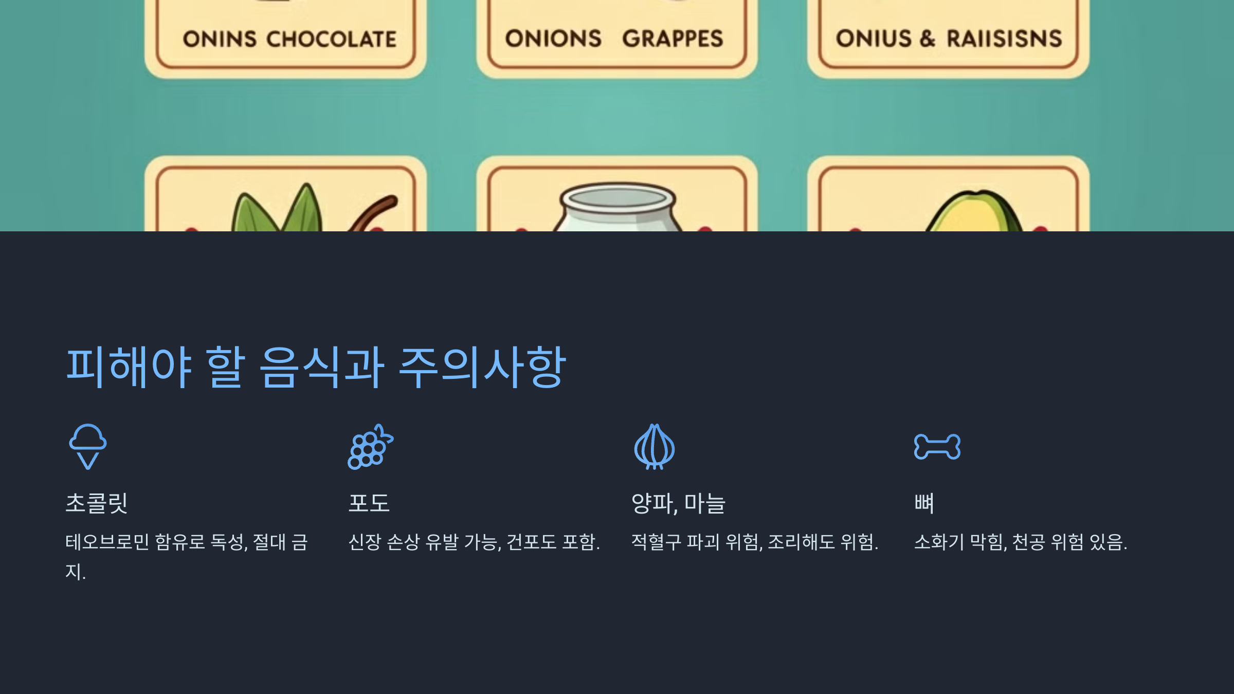 - 초콜릿, 포도, 양파, 마늘: 독성이 있어 절대 금지