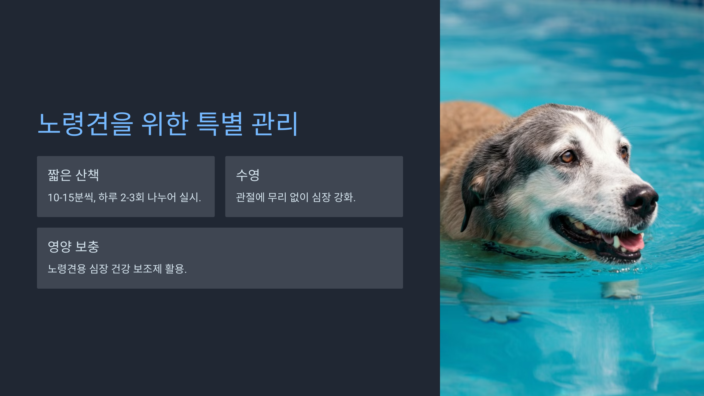 A1: 노령견은 관절에 무리가 가지 않는 가벼운 산책이나 수영이 좋습니다. 10-15분 정도의 짧은 산책을 하루 2-3회 나누어 하는 것이 효과적이에요.