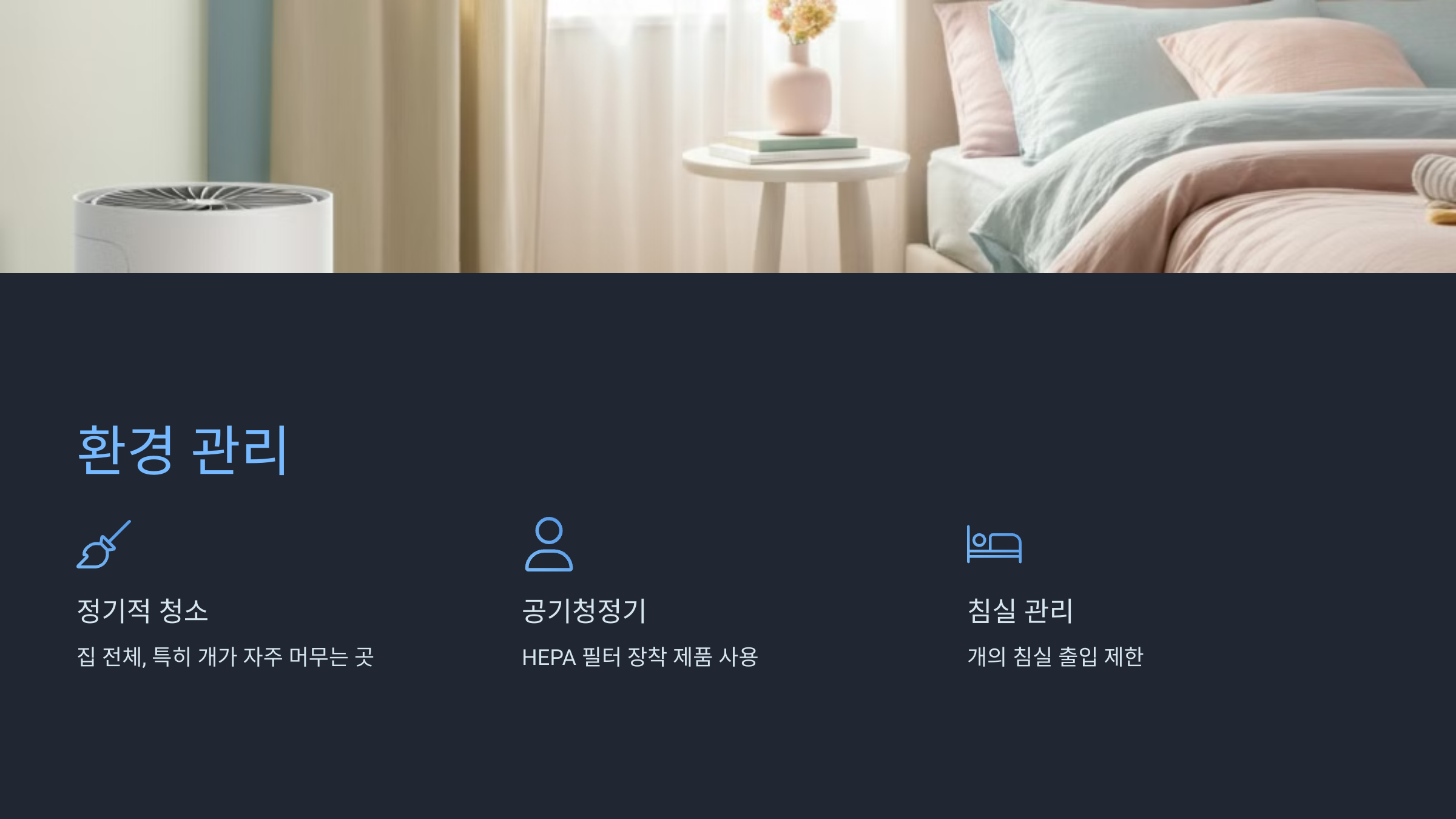 - 침실 관리: 가능하다면 개의 침실 출입을 제한하여 취침 시 알레르겐 노출을 줄입니다.