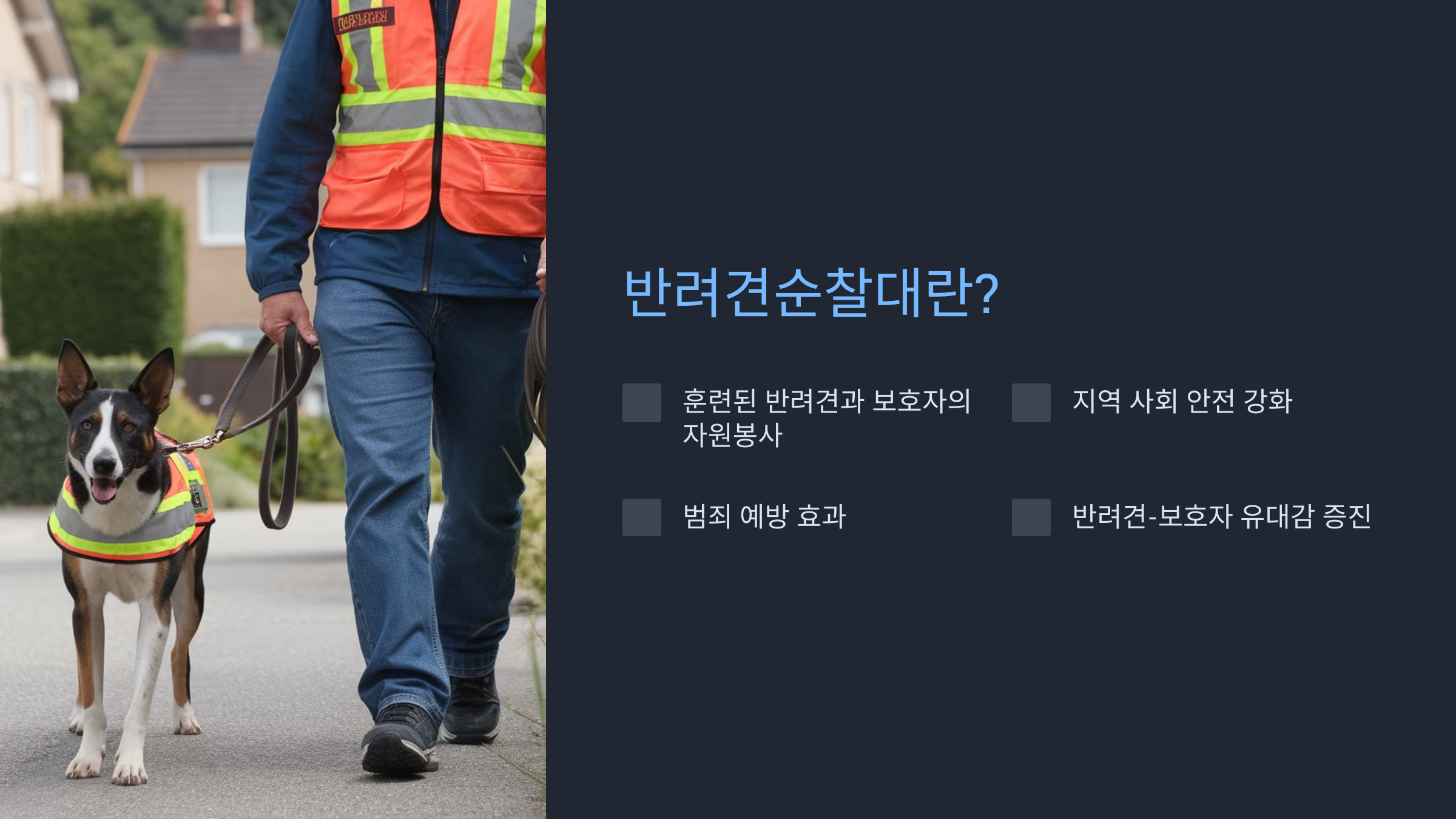 반려견순찰대는 훈련된 반려견과 그 보호자가 함께 지역을 순찰하며 안전을 도모하는 자원봉사 프로그램입니다. 이 프로그램의 주요 목적은 다음과 같습니다: