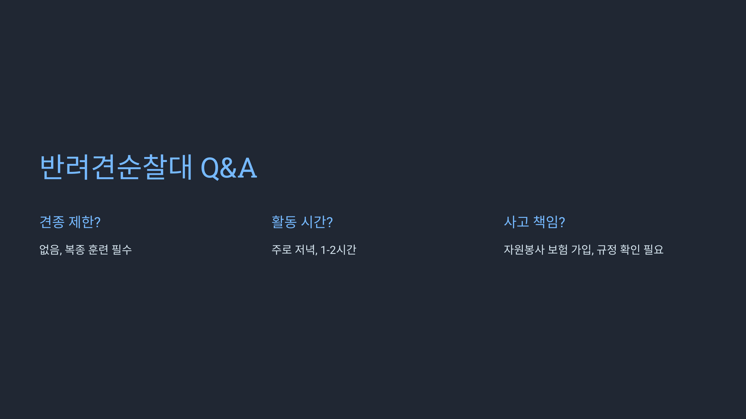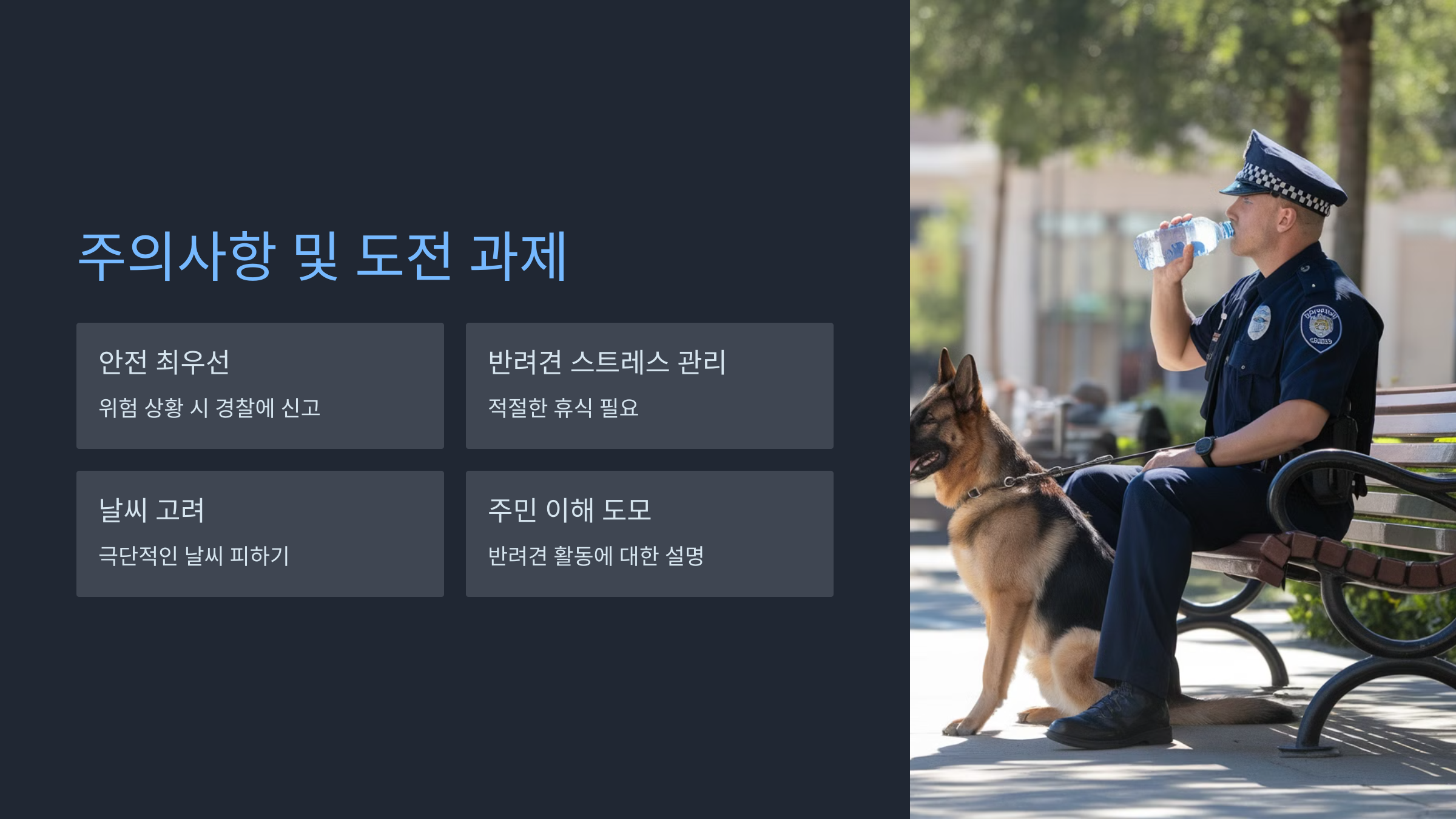 반려견순찰대 활동에는 몇 가지 주의할 점이 있습니다: