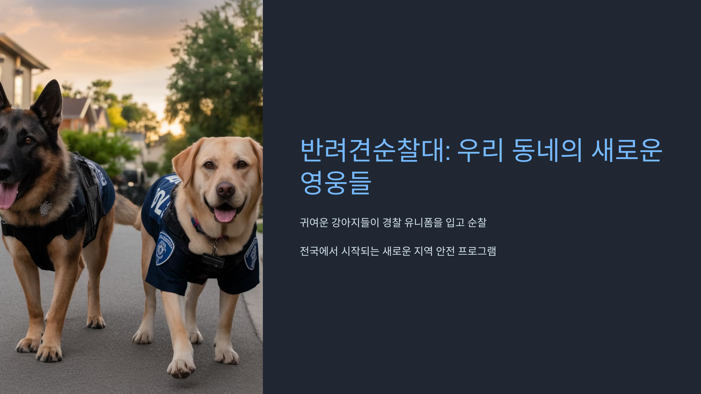 여러분, 동네를 산책하다 귀여운 강아지들이 경찰 유니폼을 입고 순찰하는 모습을 상상해보신 적 있나요? 이제 그 상상이 현실이 되었습니다! '반려견순찰대'라는 새로운 개념의 지역 안전 프로그램이 전국 곳곳에서 시작되고 있어요. 우리의 사랑스러운 반려견들이 지역 사회의 안전을 지키는 데 한몫을 하게 된 것이죠. 오늘은 이 흥미진진한 '반려견순찰대'에 대해 자세히 알아보도록 하겠습니다.