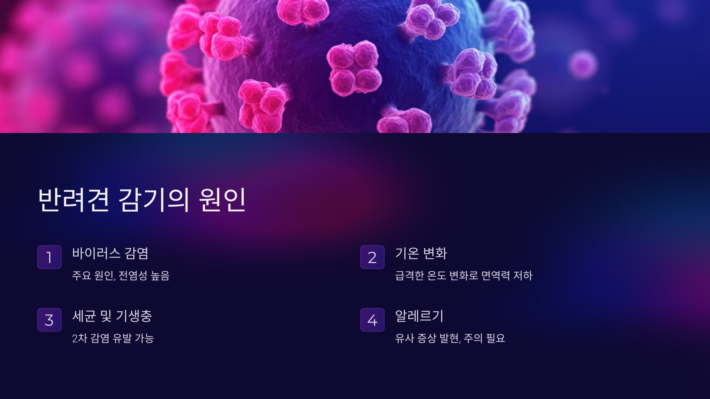 반려견 감기는 주로 바이러스 감염에 의해 발생하며, 추운 날씨나 급격한 온도 변화, 면역력 저하 등이 주요 원인이 됩니다. 이 외에도 세균이나 기생충 감염이 감기 증상을 유발할 수 있으며, 외부 자극에 의한 알레르기도 감기와 비슷한 증상을 나타낼 수 있습니다.