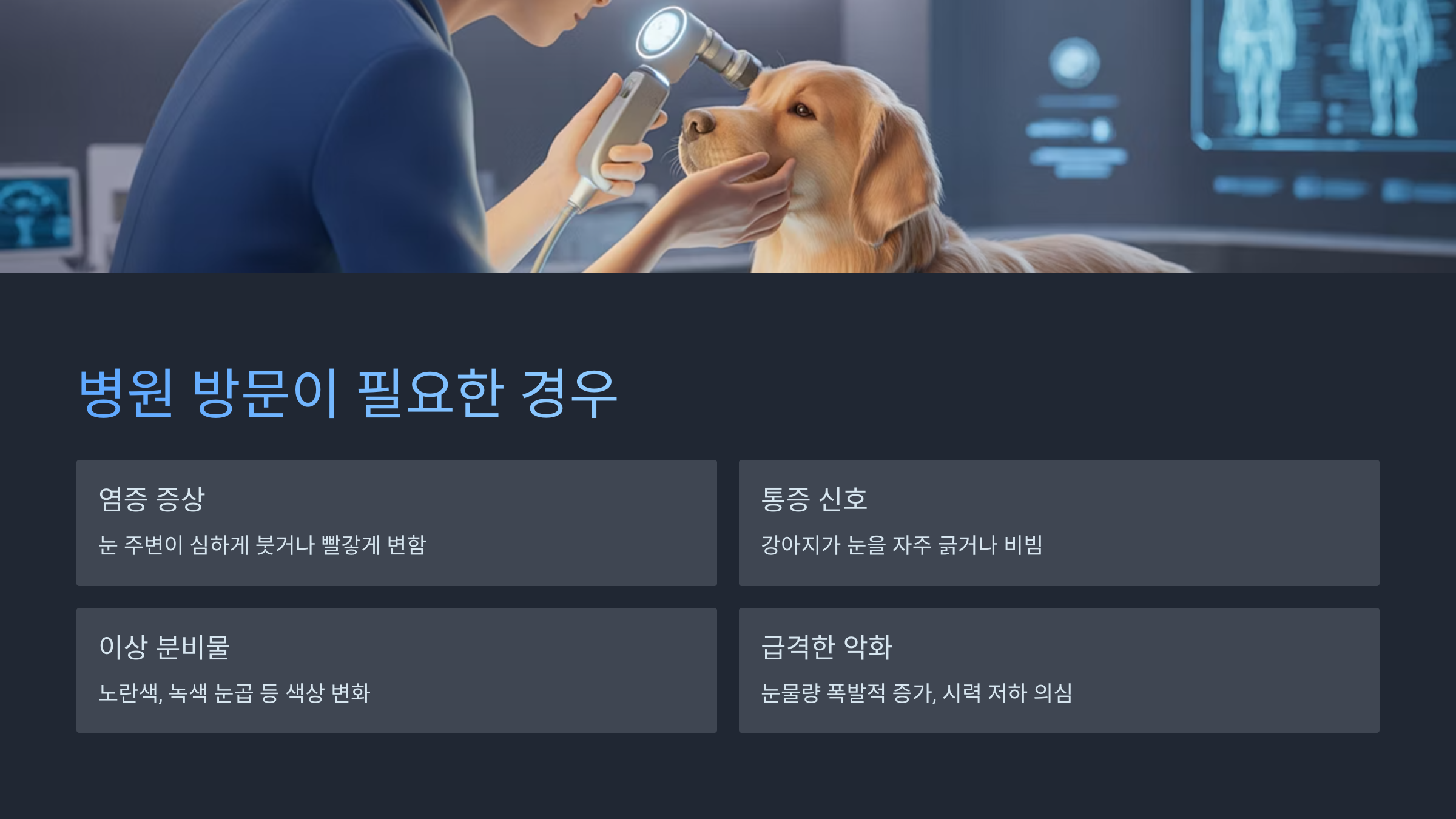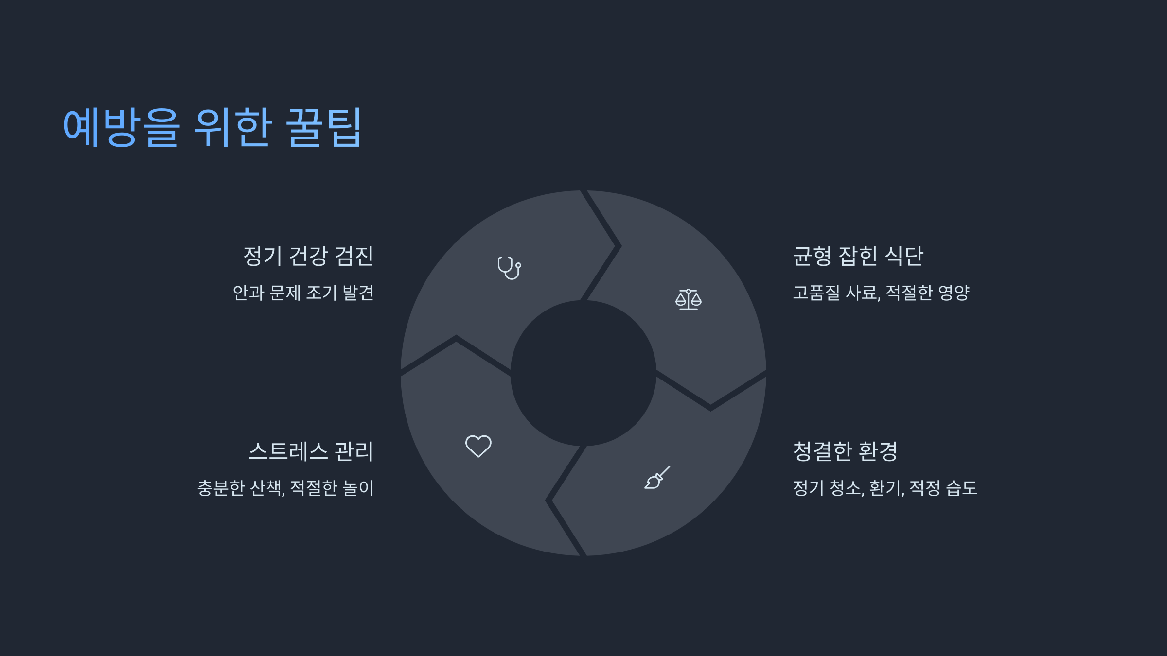 - 정기적인 동물병원 방문을 통해 눈 건강을 포함한 전반적인 건강 상태를 체크해주세요. 초기에 문제를 발견하면 더 쉽게 관리할 수 있습니다.
