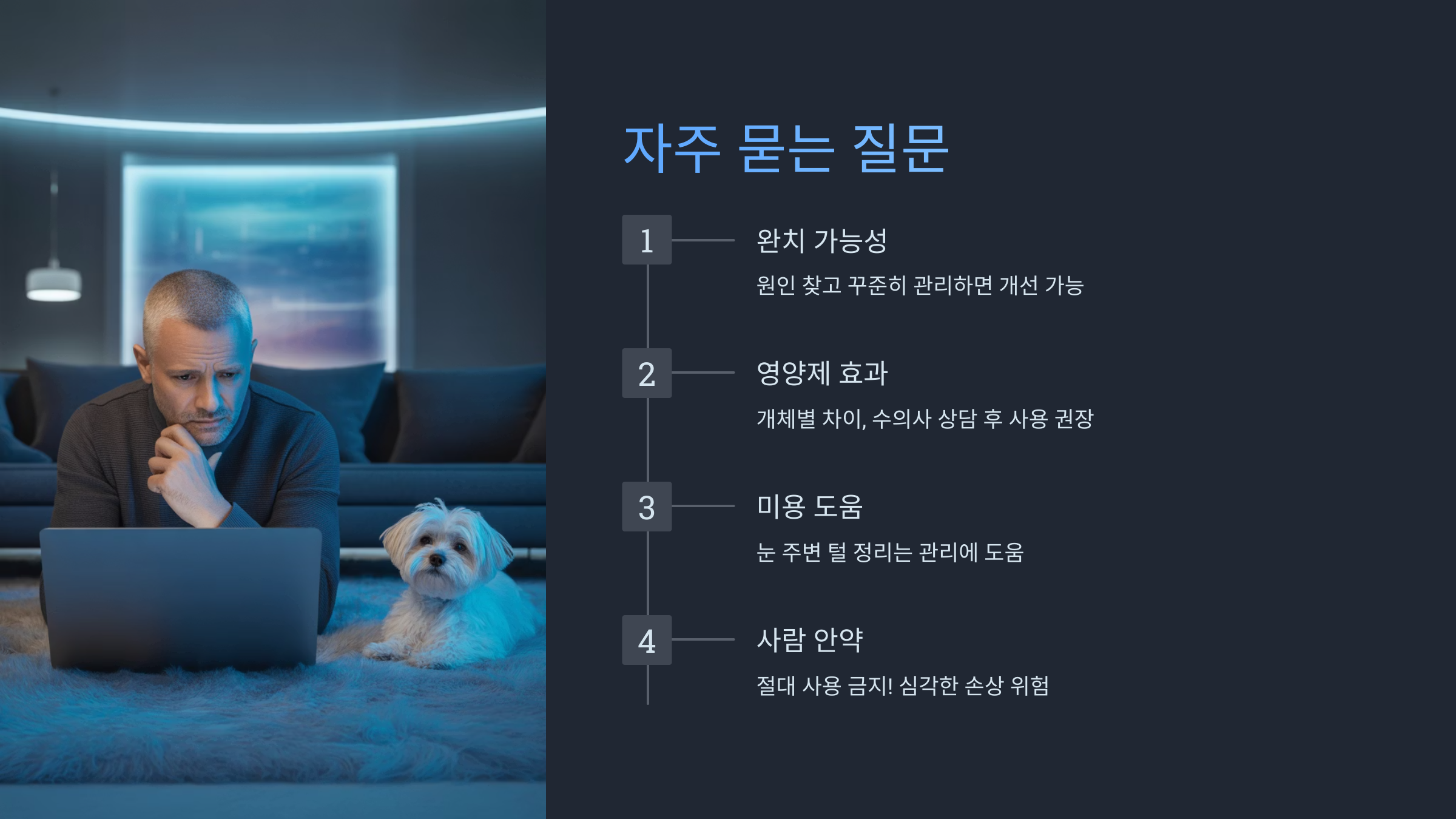 눈 건강이나 면역력 강화에 도움을 줄 수 있는 영양제들이 있지만, 모든 강아지에게 동일한 효과가 있는 것은 아니에요. 수의사와 상담 후 급여하는 것이 좋으며, 영양제보다는 근본적인 원인 해결이 우선입니다.
