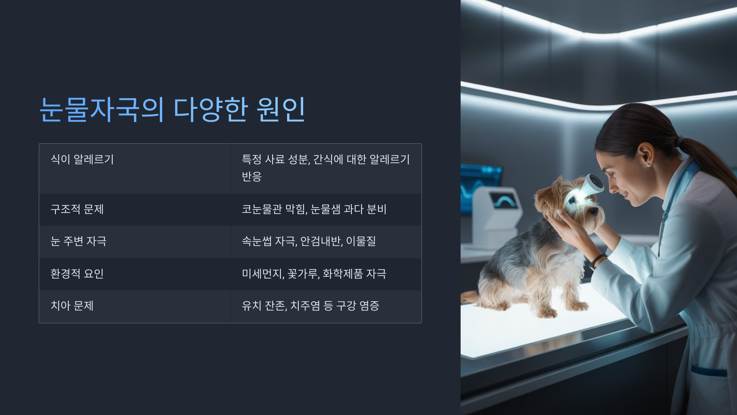 - 특정 견종의 유전적 소인: 일부 견종은 유전적으로 눈물 과다, 안검내반, 첩모 이상 등의 문제를 가질 확률이 높기도 합니다.