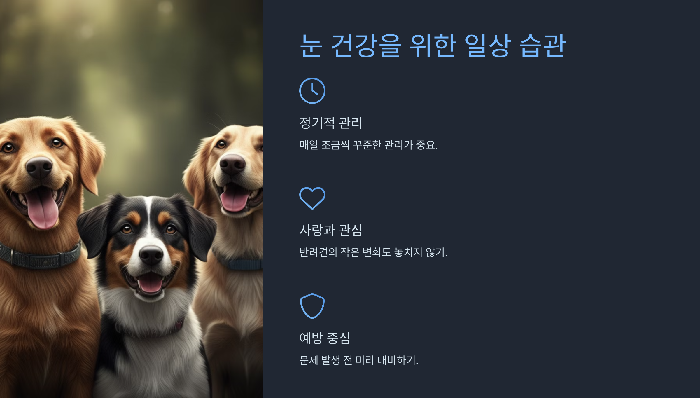 반려견의 눈 건강을 지키는 것은 생각보다 어렵지 않습니다. 일상에서의 작은 관심과 케어만으로도 많은 안구 질환을 예방할 수 있어요. 정기적인 청소, 균형 잡힌 영양 공급, 주기적인 검진, 안전한 환경 조성, 그리고 스트레스 관리. 이 다섯 가지 핵심 팁을 실천한다면, 우리 반려견의 눈은 더욱 건강하고 밝게 빛날 거예요.