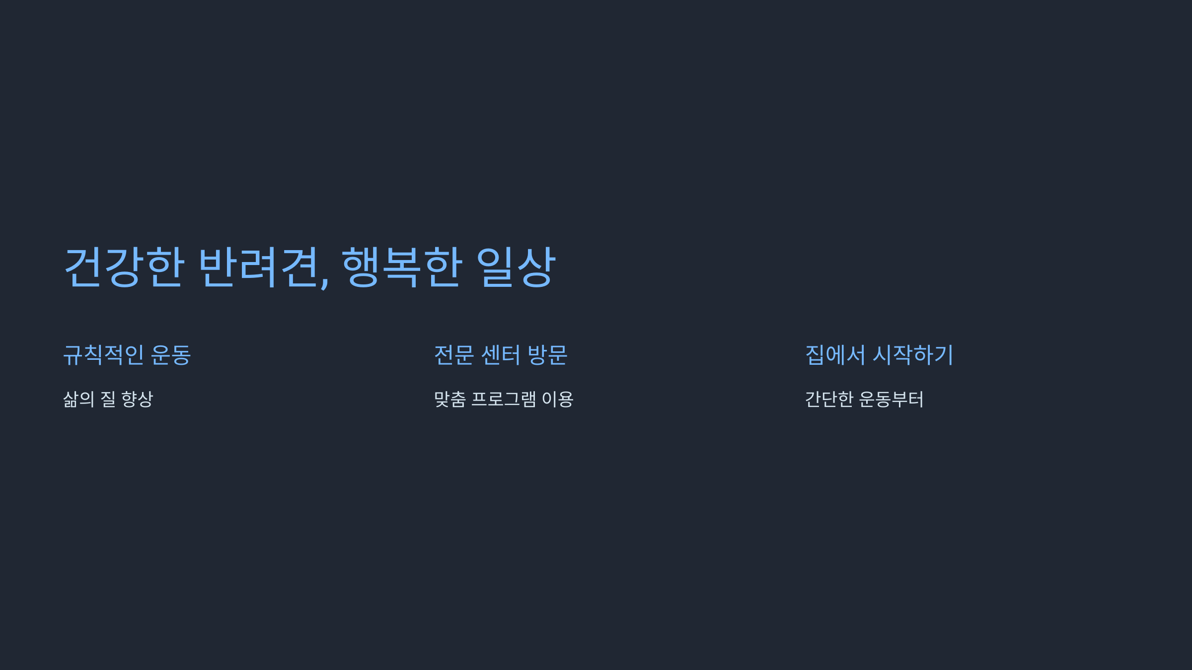 건강한 반려견과 함께하는 행복한 일상을 만들어가세요. 여러분의 작은 관심과 노력이 반려견의 삶을 더욱 풍요롭게 만들 수 있습니다. 함께 건강해지는 즐거운 여정을 시작해봐요! ?