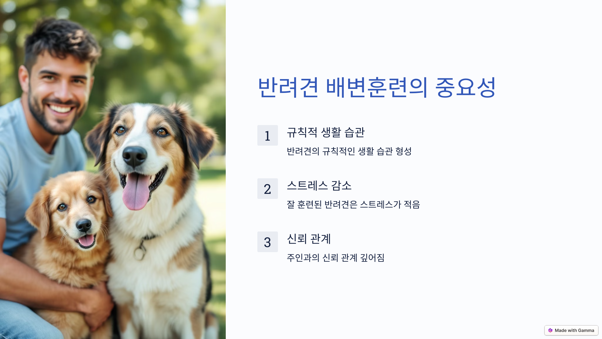 배변훈련은 단순히 배변을 가르치는 것을 넘어, 반려견의 규칙적인 생활 습관을 만드는 데 도움을 줍니다. 잘 훈련된 반려견은 스트레스가 적고 주인과의 신뢰 관계도 더 깊어지게 됩니다.