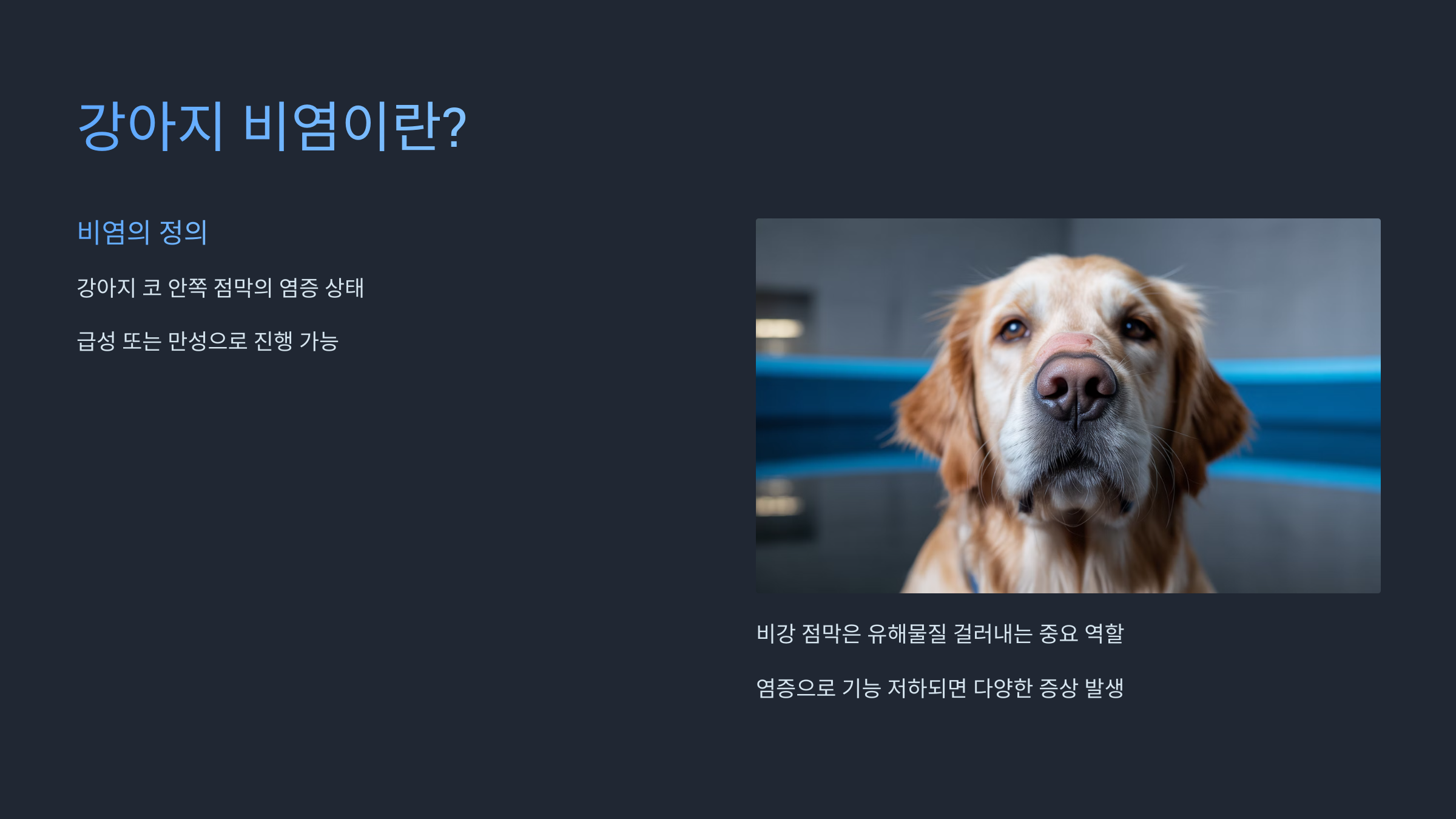 강아지의 코 안쪽, 즉 비강 내 점막에 염증이 생긴 상태를 말합니다.