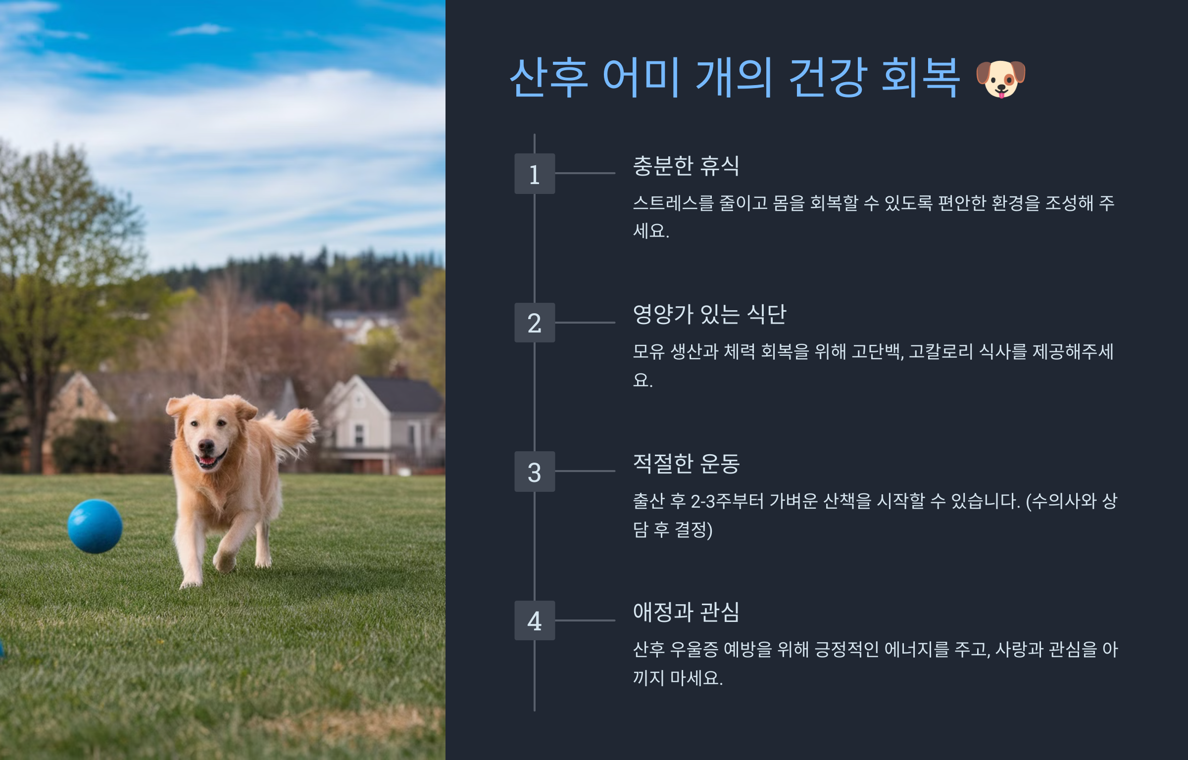A: 스트레스나 건강 문제로 인한 경우일 수 있습니다. 즉시 수의사와 상담하고, 필요시 인공 수유 등의 방법을 고려해야 합니다. - Q: 산후 어미 개의 운동은 언제부터 시작해야 하나요?