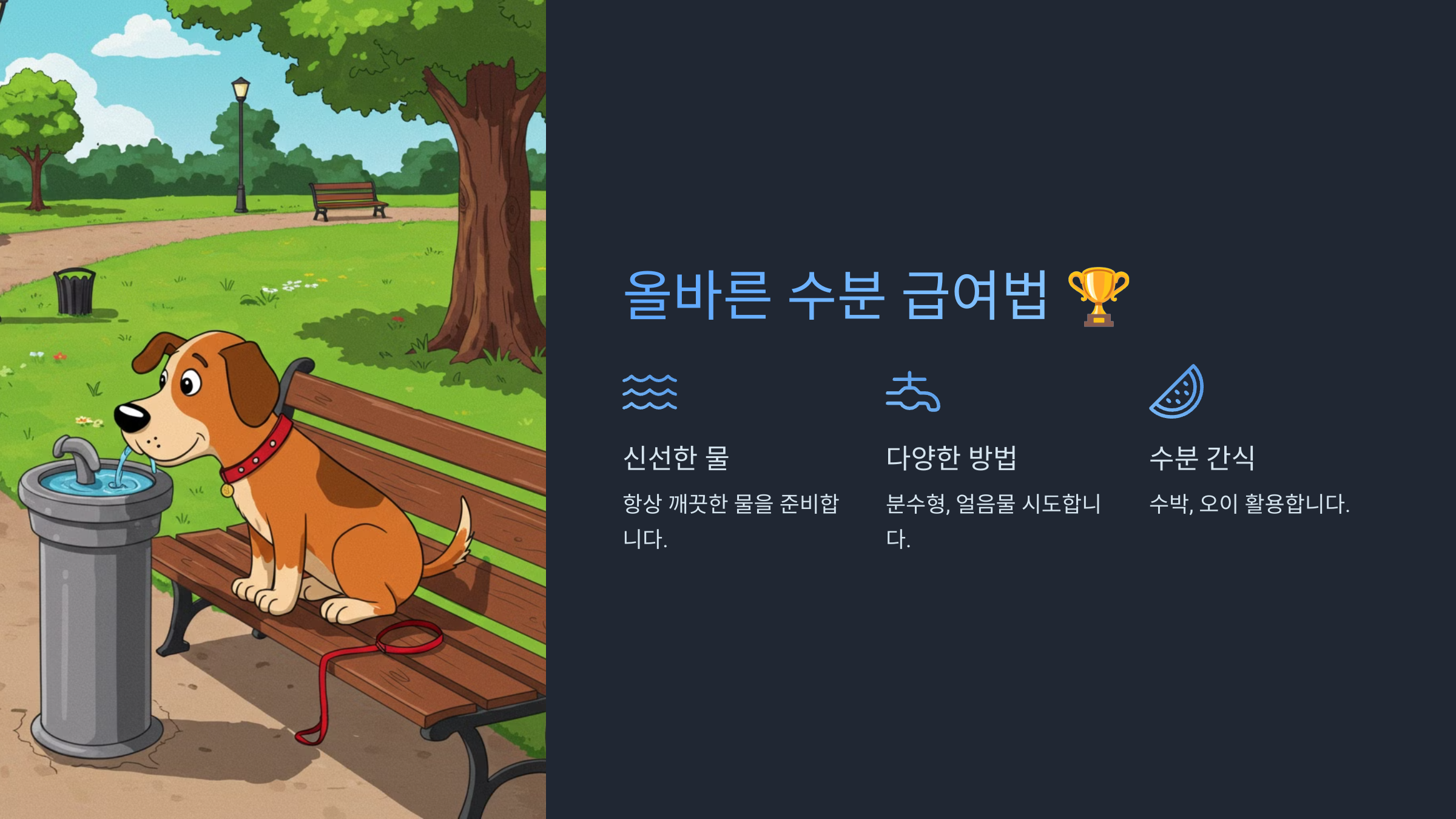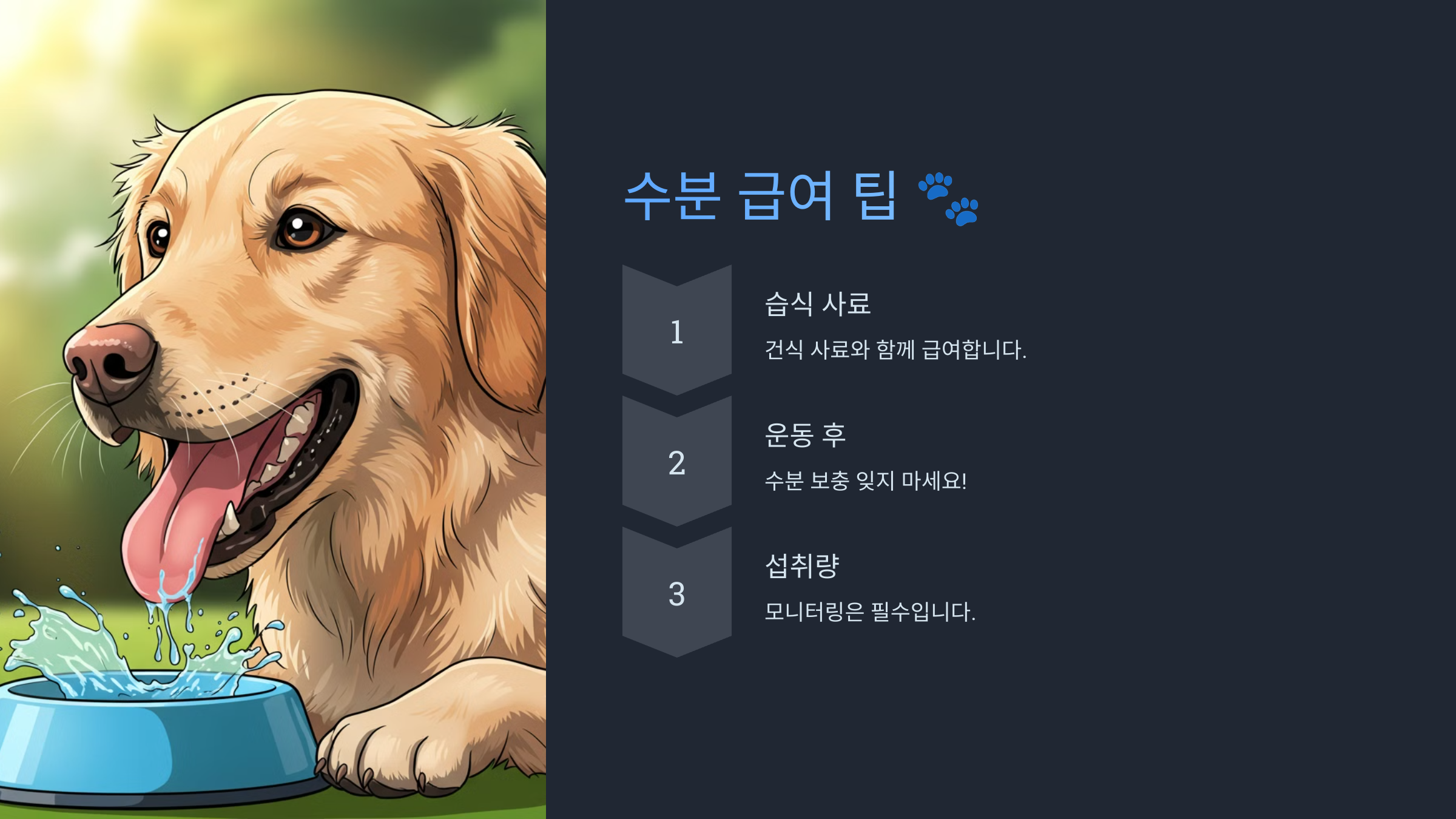 여러분의 작은 관심과 노력이 반려견의 건강한 삶을 만듭니다. 오늘부터 반려견의 수분 섭취에 더 많은 관심을 기울여보는 건 어떨까요? 건강하고 행복한 반려견과 함께하는 삶, 바로 여러분의 손끝에서 시작됩니다!