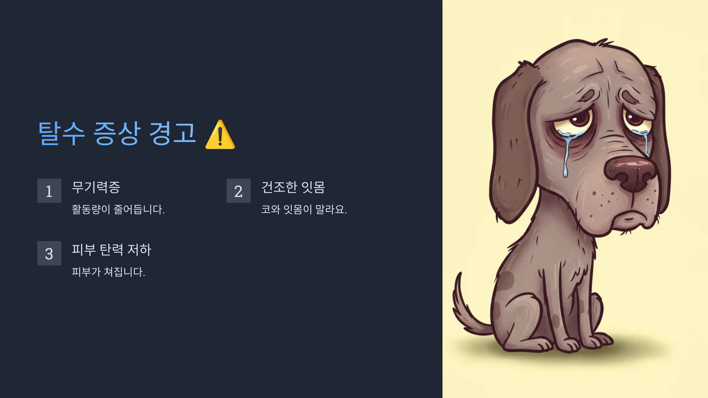 수분 섭취가 부족하면 반려견의 건강에 심각한 문제가 생길 수 있습니다. 다음과 같은 탈수 증상이 나타나면 즉시 조치가 필요합니다: