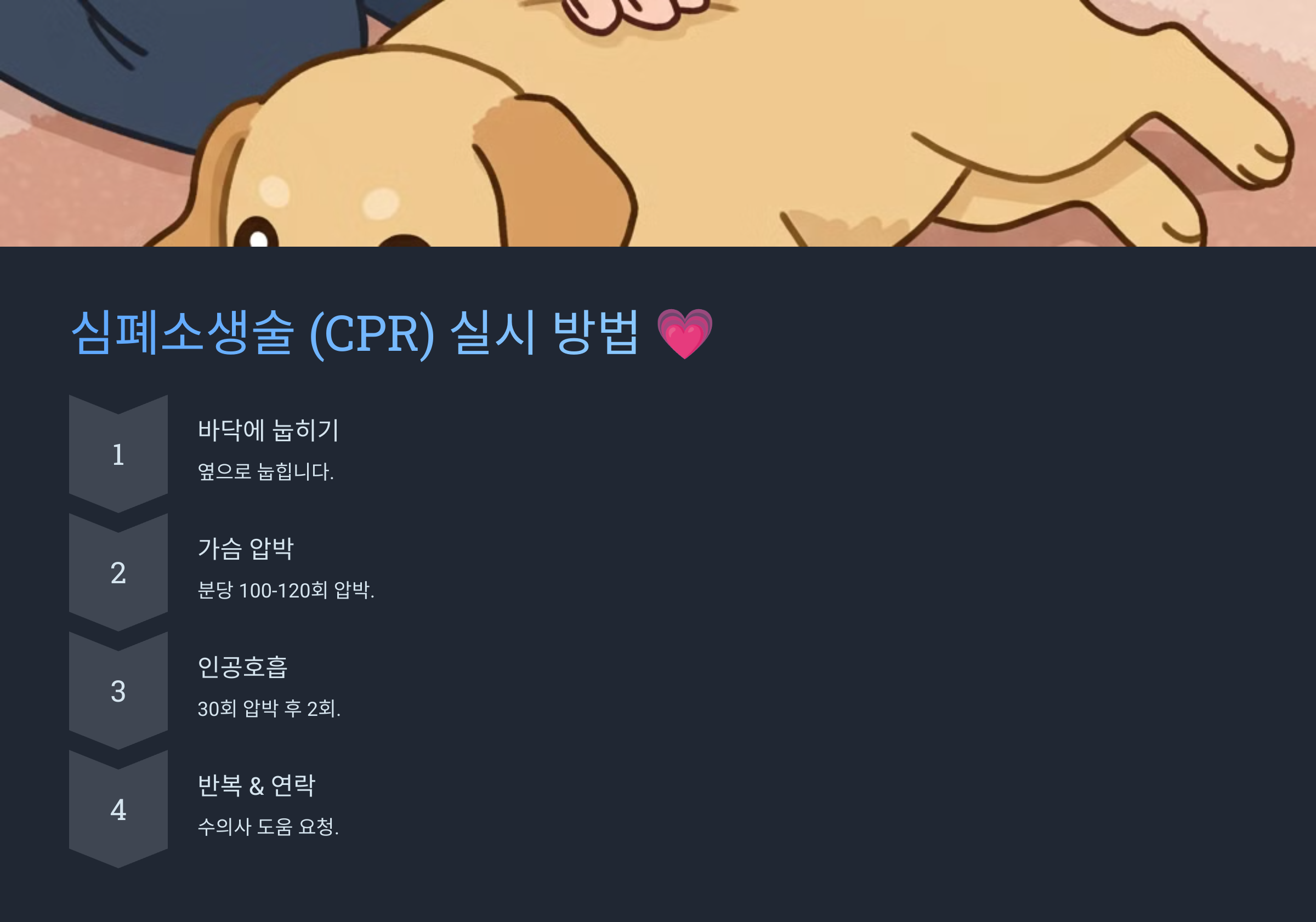 우리의 소중한 가족인 반려견을 위해, 오늘부터 응급처치 방법을 익히고 실천해보는 건 어떨까요? 여러분의 작은 준비가 반려견의 생명을 구하는 큰 힘이 될 수 있습니다. 건강하고 행복한 반려 생활을 위해, 함께 노력해 나가시길 바랍니다!
