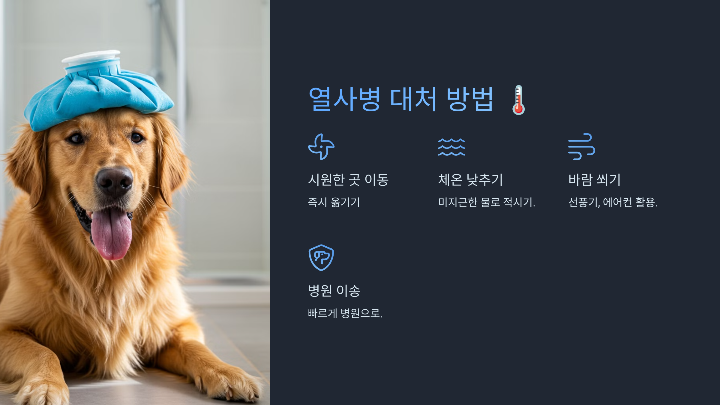- 미지근한 물로 몸을 적셔 체온을 낮춥니다. 너무 차가운 물은 오히려 해로울 수 있습니다.