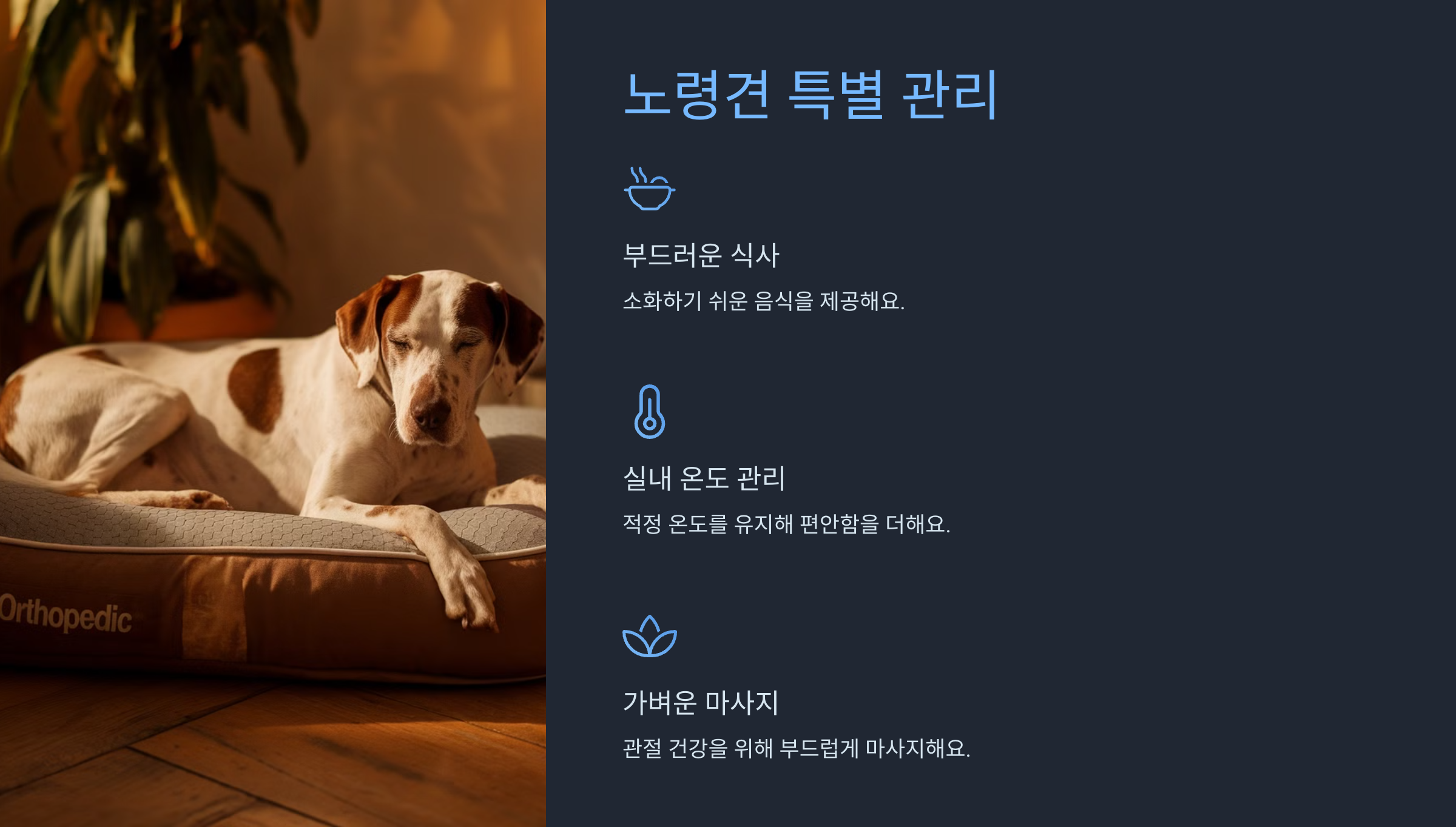 A5: 노령견은 더 세심한 관리가 필요해요. 부드러운 음식 제공, 적당한 실내 온도 유지, 미끄럽지 않은 바닥재 사용 등이 중요합니다. 또한, 관절 건강을 위한 보조제 섭취나 가벼운 마사지도 도움이 될 수 있어요. 무엇보다 더 자주 수의사와 상담하는 것이 중요합니다.