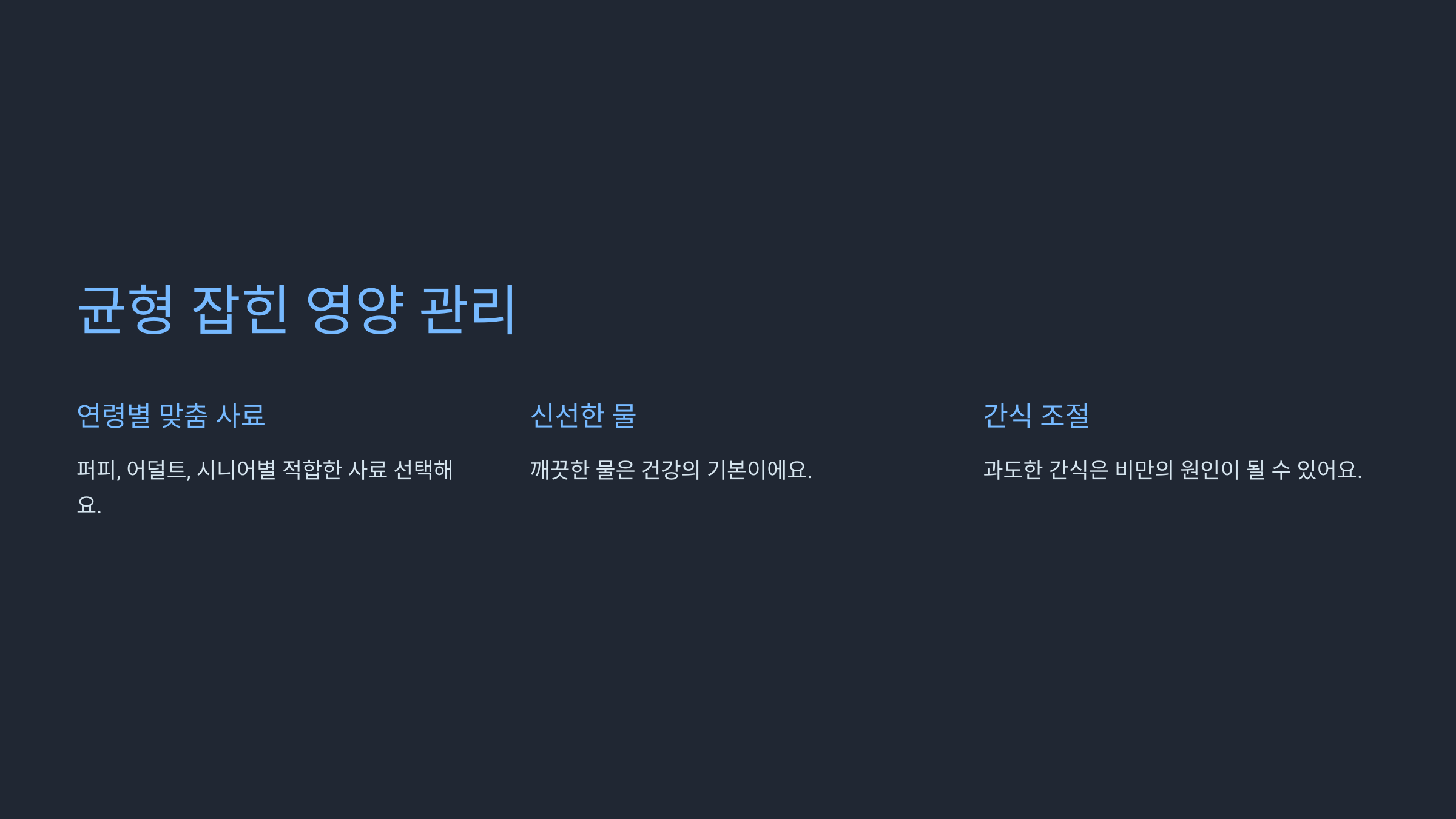 - 신선한 물 항상 제공: 깨끗한 물은 건강의 기본이에요.