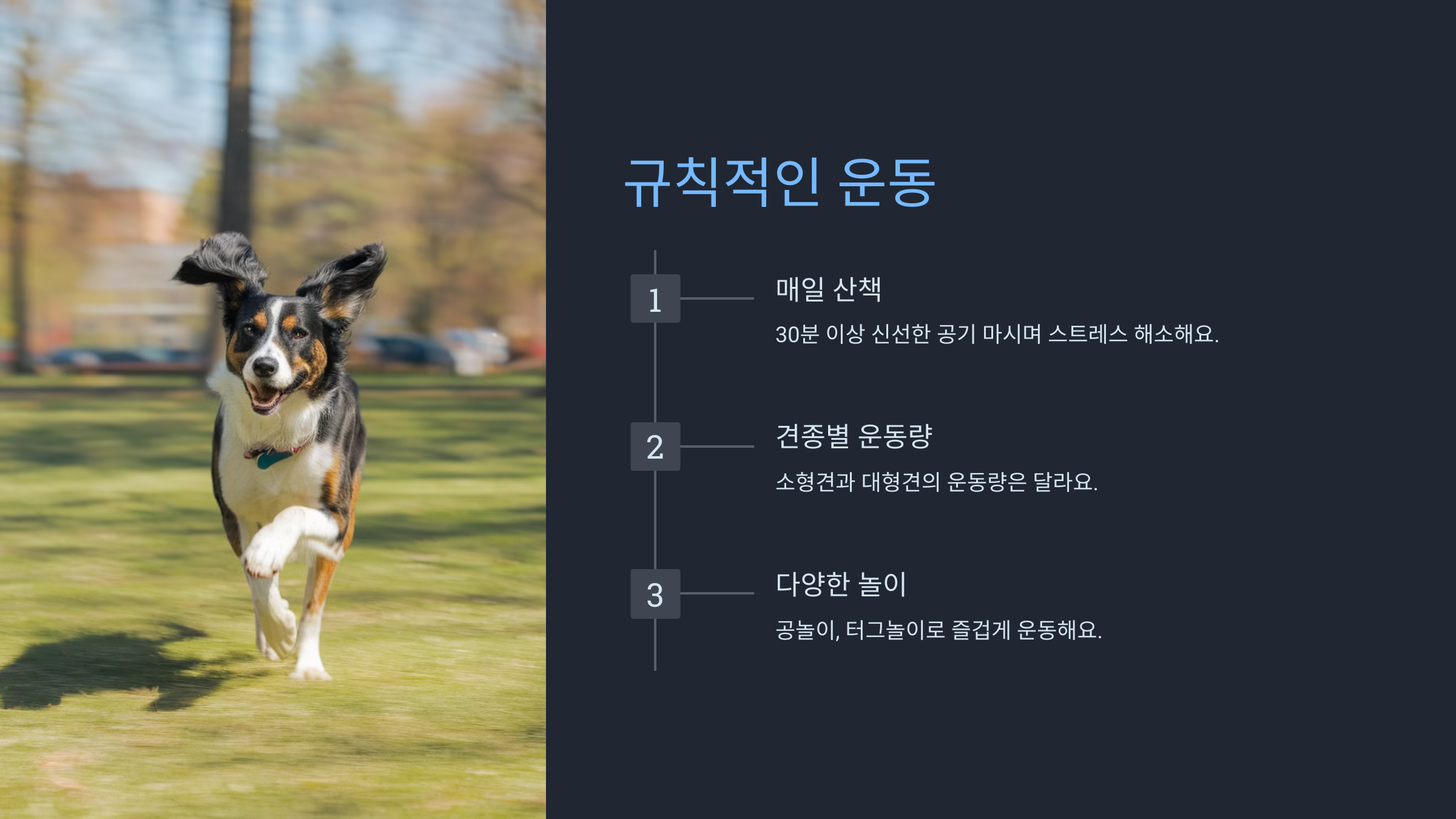 운동은 반려견의 신체적, 정신적 건강에 필수적입니다.