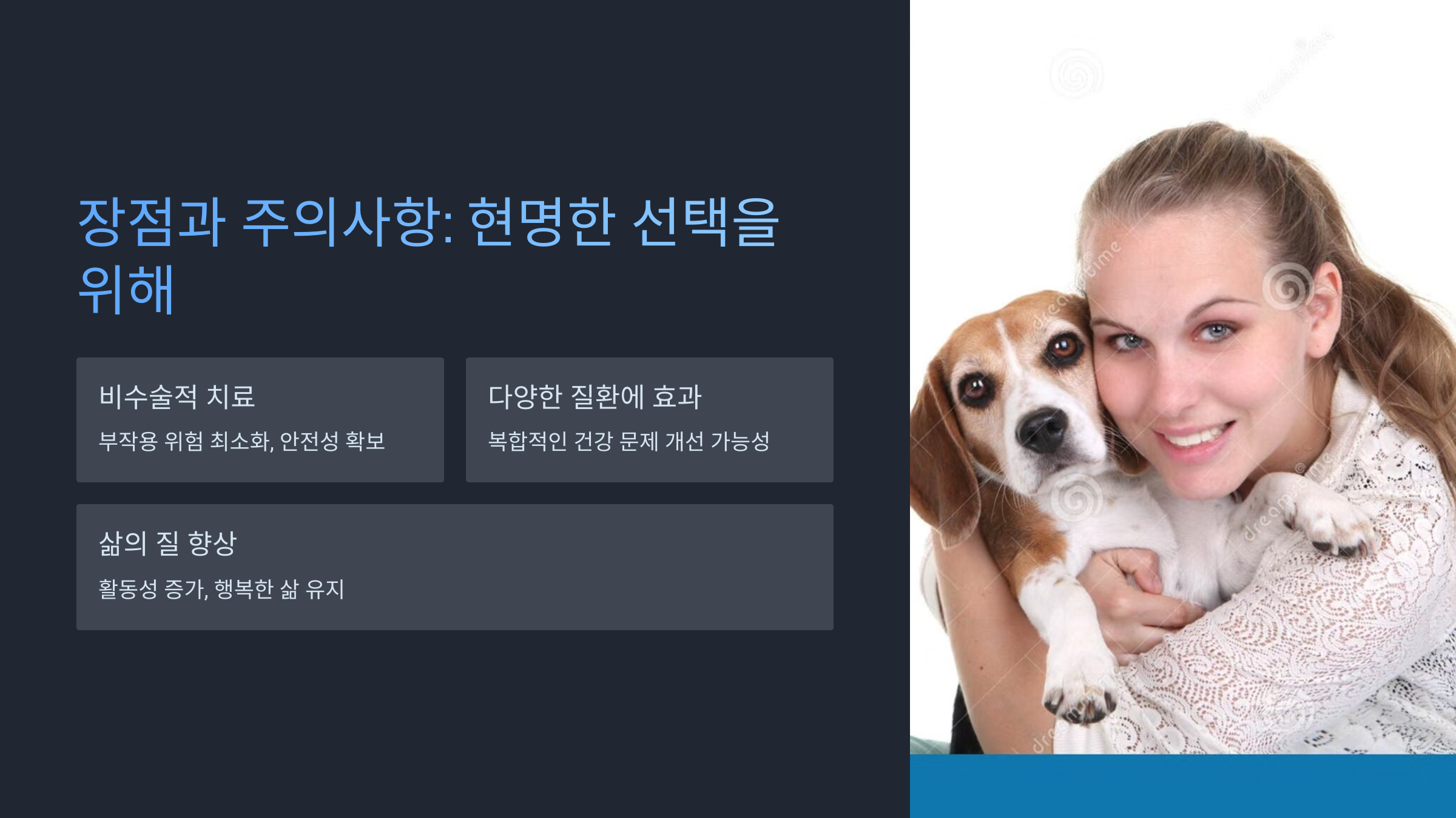 줄기세포 치료는 반려견들에게 새로운 희망을 제시합니다. 특히 기존 치료법으로 개선이 어려웠던 난치성 질환에 대해 긍정적인 결과를 보여주고 있습니다. 하지만 이는 만능 해결책이 아니며, 각 반려견의 상태와 질병에 따라 적절히 적용되어야 합니다.