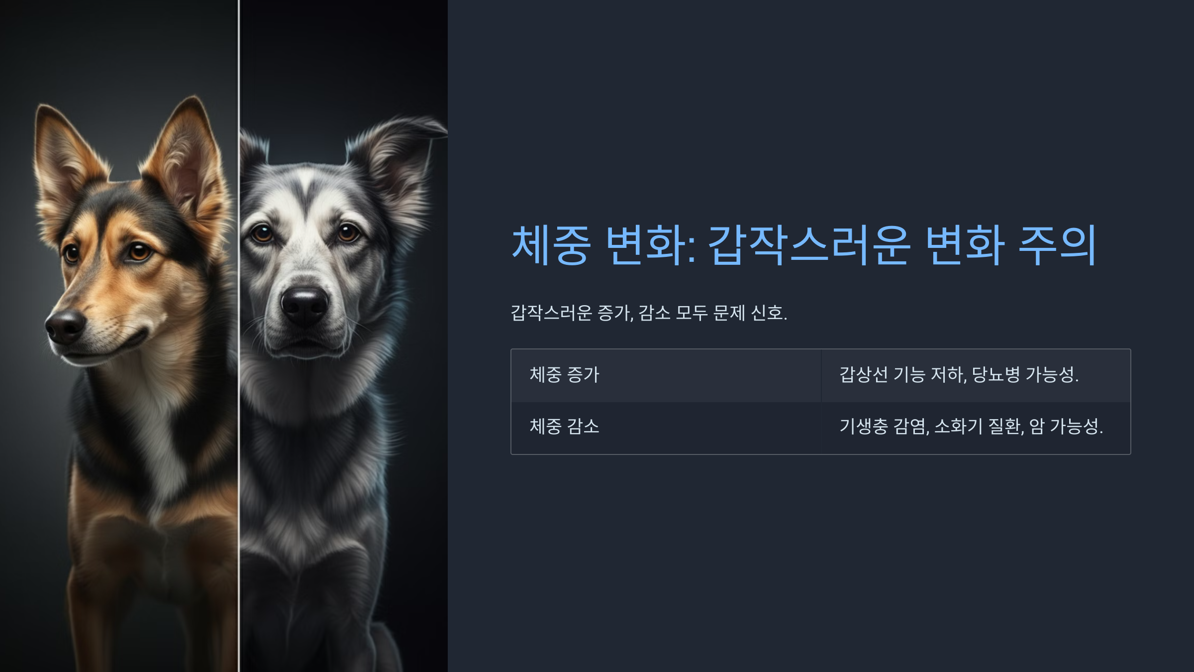- 의미: 갑작스러운 체중 변화는 내분비계 문제(예: 갑상선 기능 저하증)나 심각한 질병을 암시할 수 있습니다.