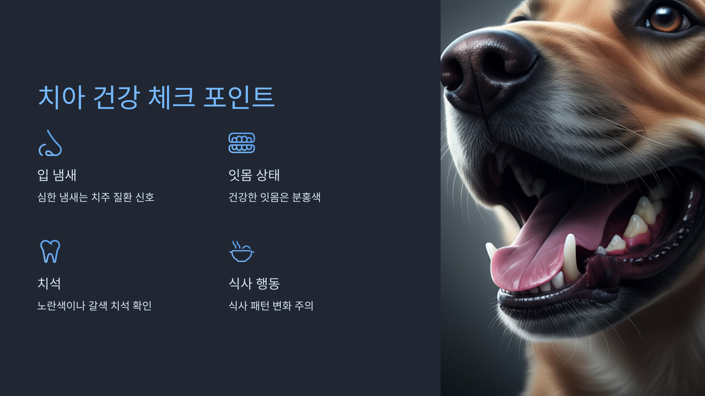 반려견의 치아 상태를 주기적으로 체크하는 것이 중요합니다. 다음 사항들을 확인해보세요: