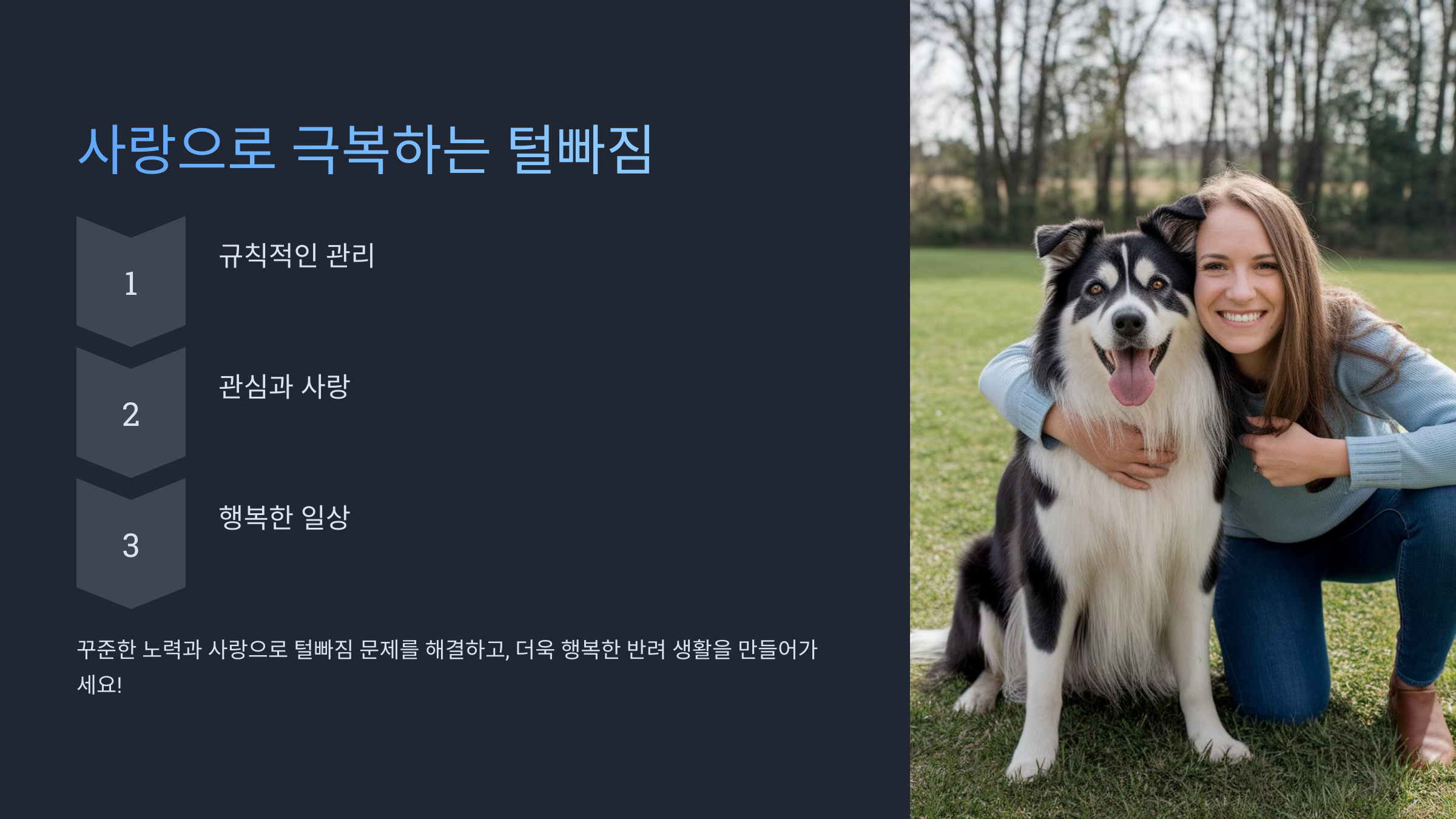 오늘 배운 방법들을 실천해보세요. 털빠짐 걱정 없이 반려견과 함께하는 행복한 일상이 여러분을 기다리고 있습니다. 사랑하는 마음으로 시작하는 털빠짐 관리, 지금 바로 시작해보는 건 어떨까요? ??