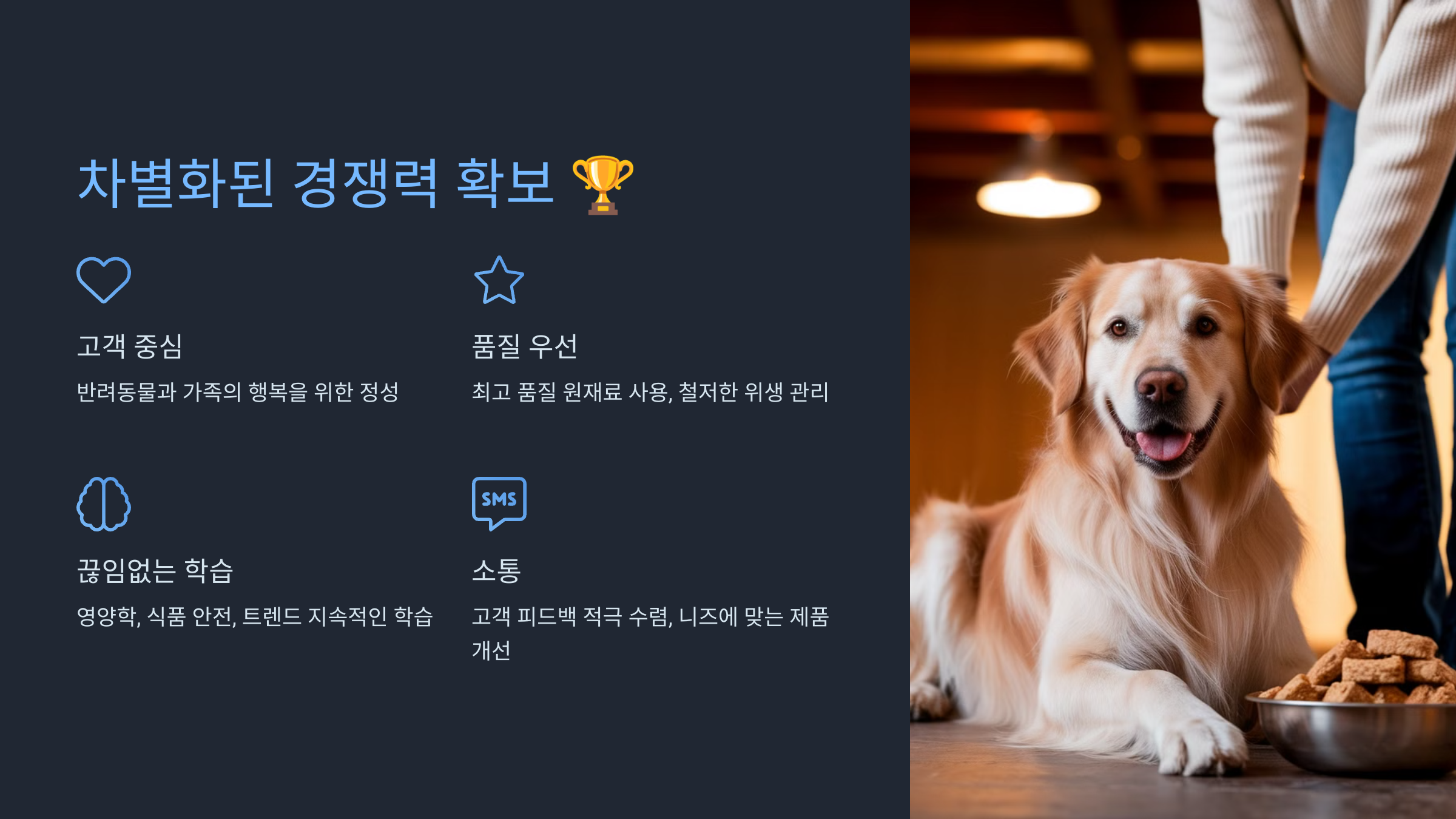 최고 품질의 원재료 사용과 철저한 위생 관리로 신뢰를 쌓아가세요. 반려인들의 입소문은 사업 성공의 핵심입니다.