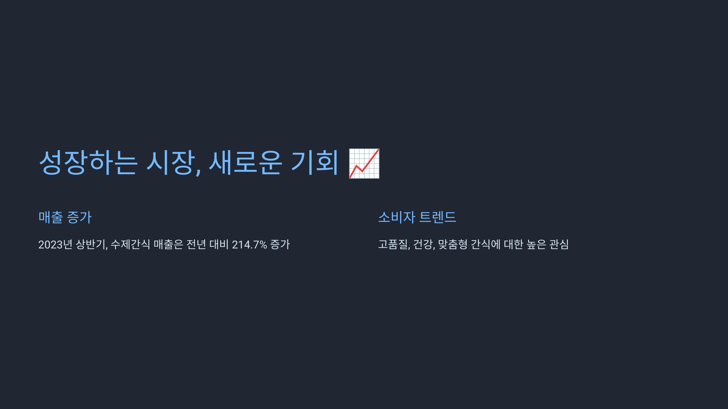 반려동물 수제간식 시장은 놀라운 속도로 성장하고 있습니다. GS리테일의 반려동물 플랫폼 '어바웃펫'의 자료에 따르면, 2023년 상반기 수제간식 매출이 전년 동기 대비 무려 214.7% 증가했다고 합니다. 이는 반려인들이 점점 더 고품질의 간식을 선호하고 있다는 증거입니다.