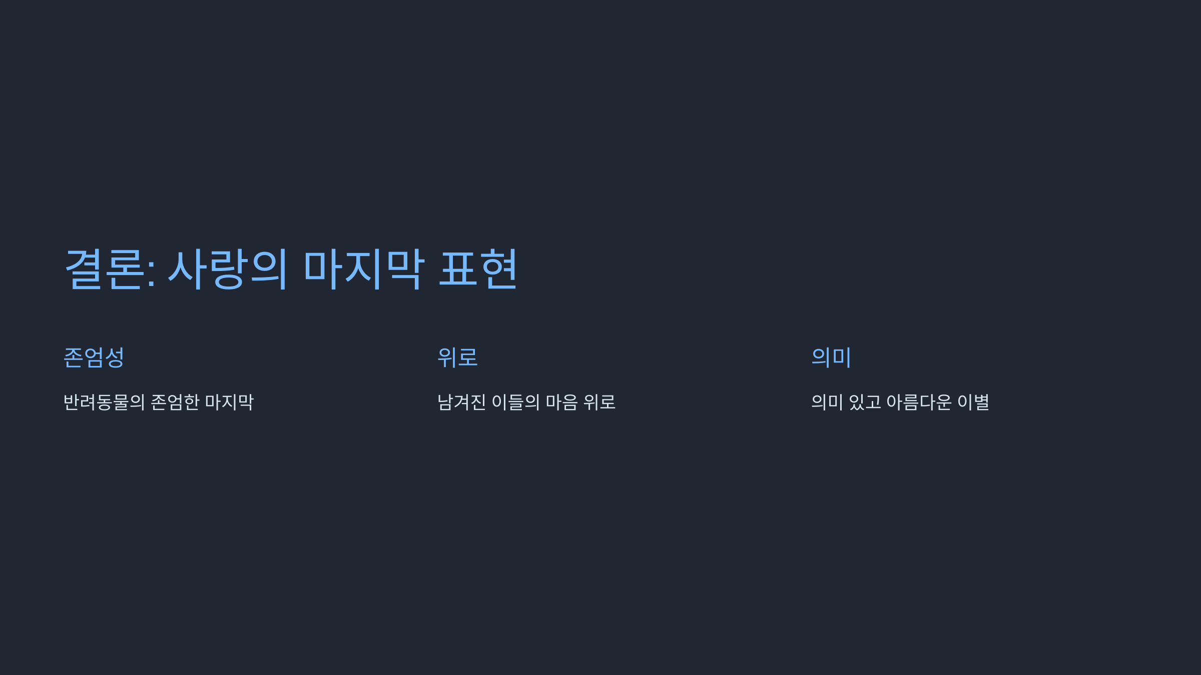 여러분도 언젠가는 이런 서비스가 필요할 수 있습니다. 그때 반려동물 장례지도사의 도움을 받는다면, 사랑하는 반려동물과의 마지막 이별을 조금 더 의미 있고 아름답게 만들 수 있을 거예요. 우리의 소중한 가족이었던 그들에게, 그리고 우리 자신에게 선물하는 마지막 사랑의 표현이 될 수 있을 것입니다.