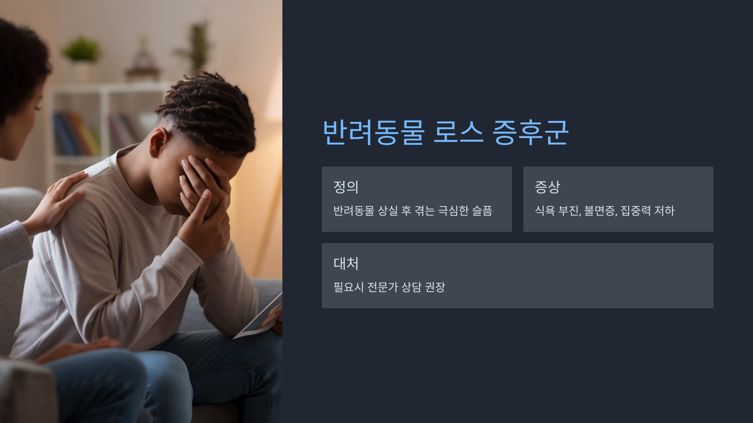 A: 반려동물을 잃은 후 겪는 극심한 슬픔과 우울감을 말합니다. 식욕 부진, 불면증, 집중력 저하 등의 증상이 나타날 수 있으며, 심각한 경우 전문가의 상담이 필요할 수 있습니다.