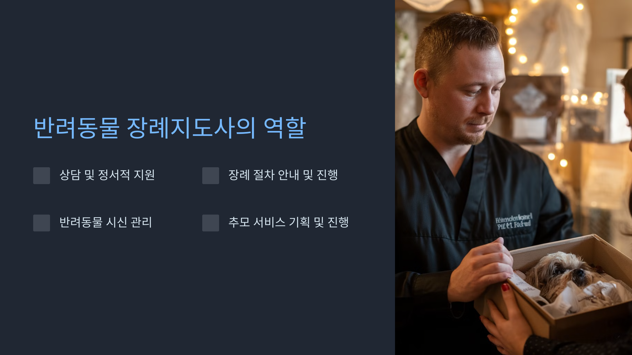 - 상담 능력: 슬픔에 빠진 반려인을 위로하고 지원할 수 있는 상담 기술