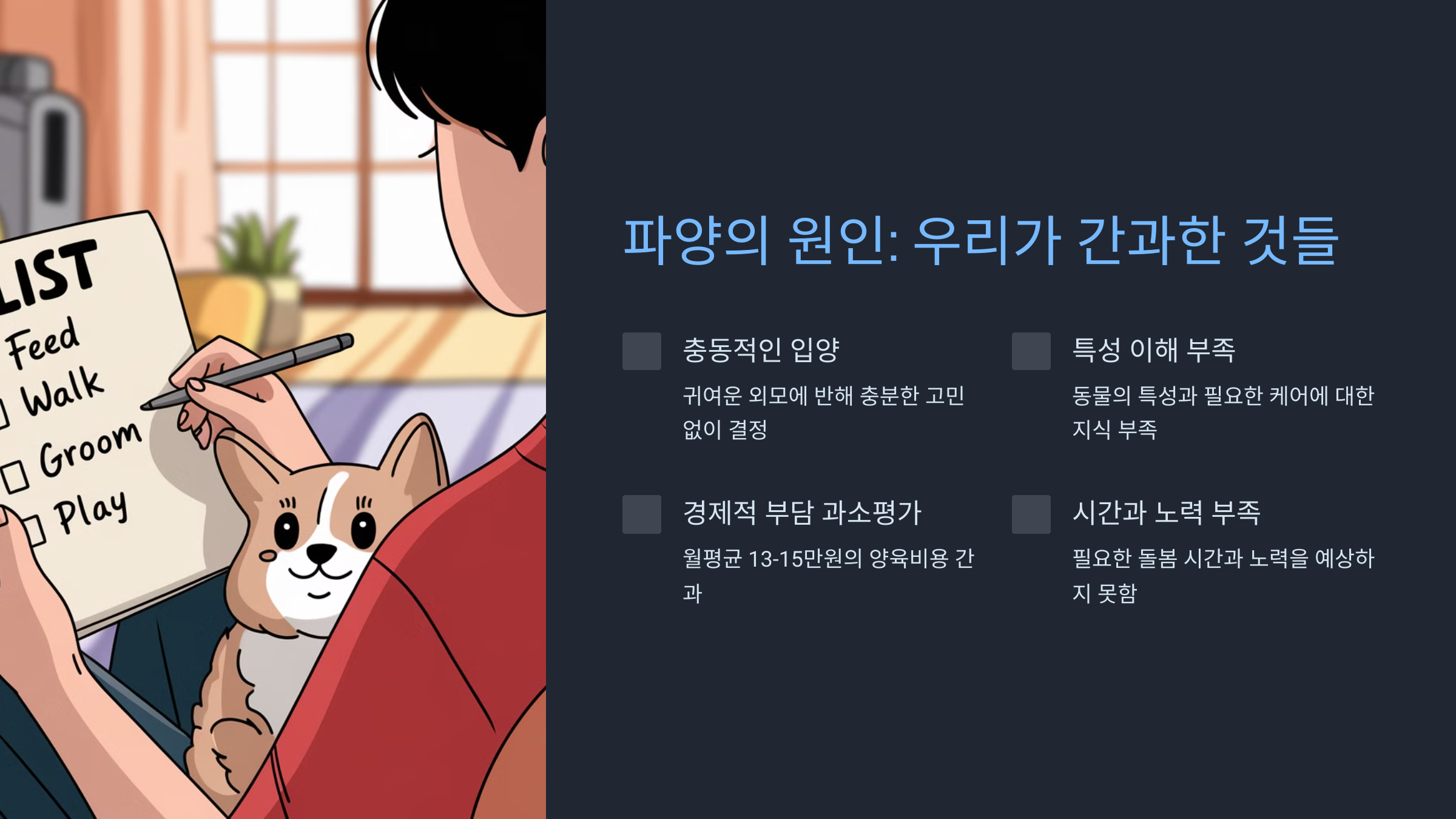 파양의 원인을 더 자세히 들여다보면, 많은 경우 예방 가능한 문제들임을 알 수 있습니다.