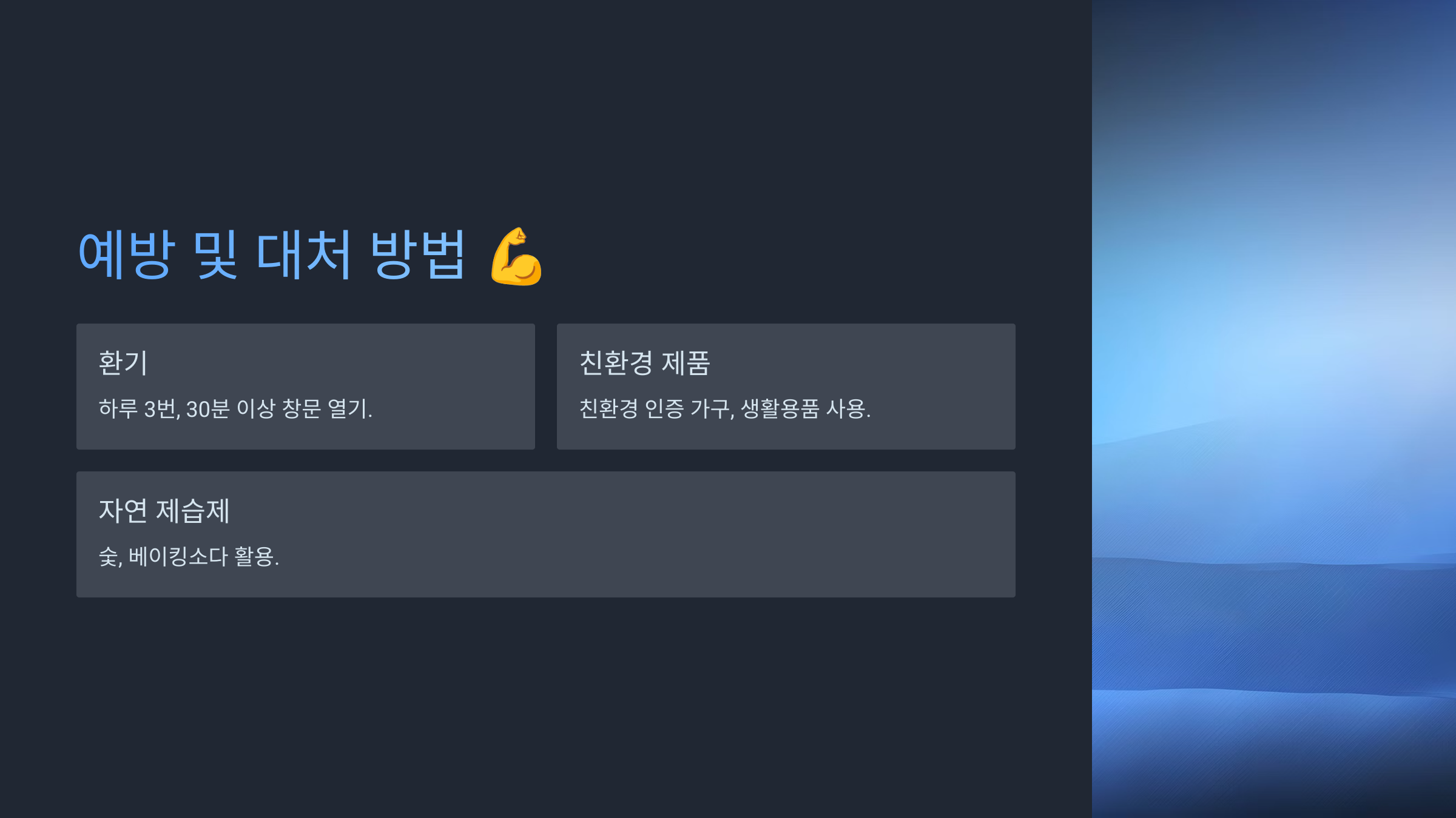 숯이나 베이킹소다 같은 자연 제습제를 곳곳에 두면 유해물질 흡수에 도움이 됩니다. 우리 집에서는 숯 팩을 여러 군데 두었더니 공기가 한결 깨끗해진 느낌이었어요.