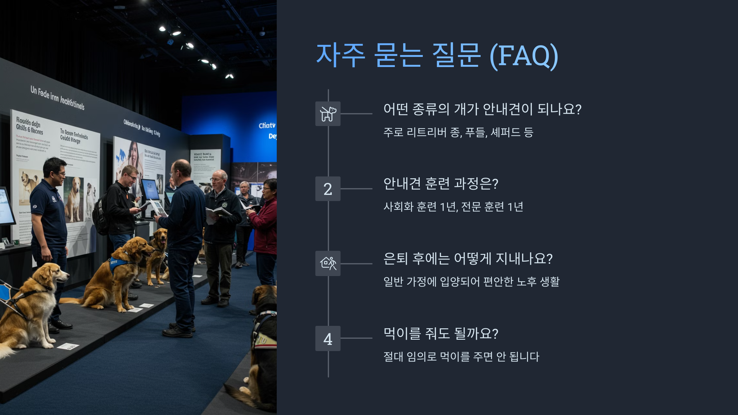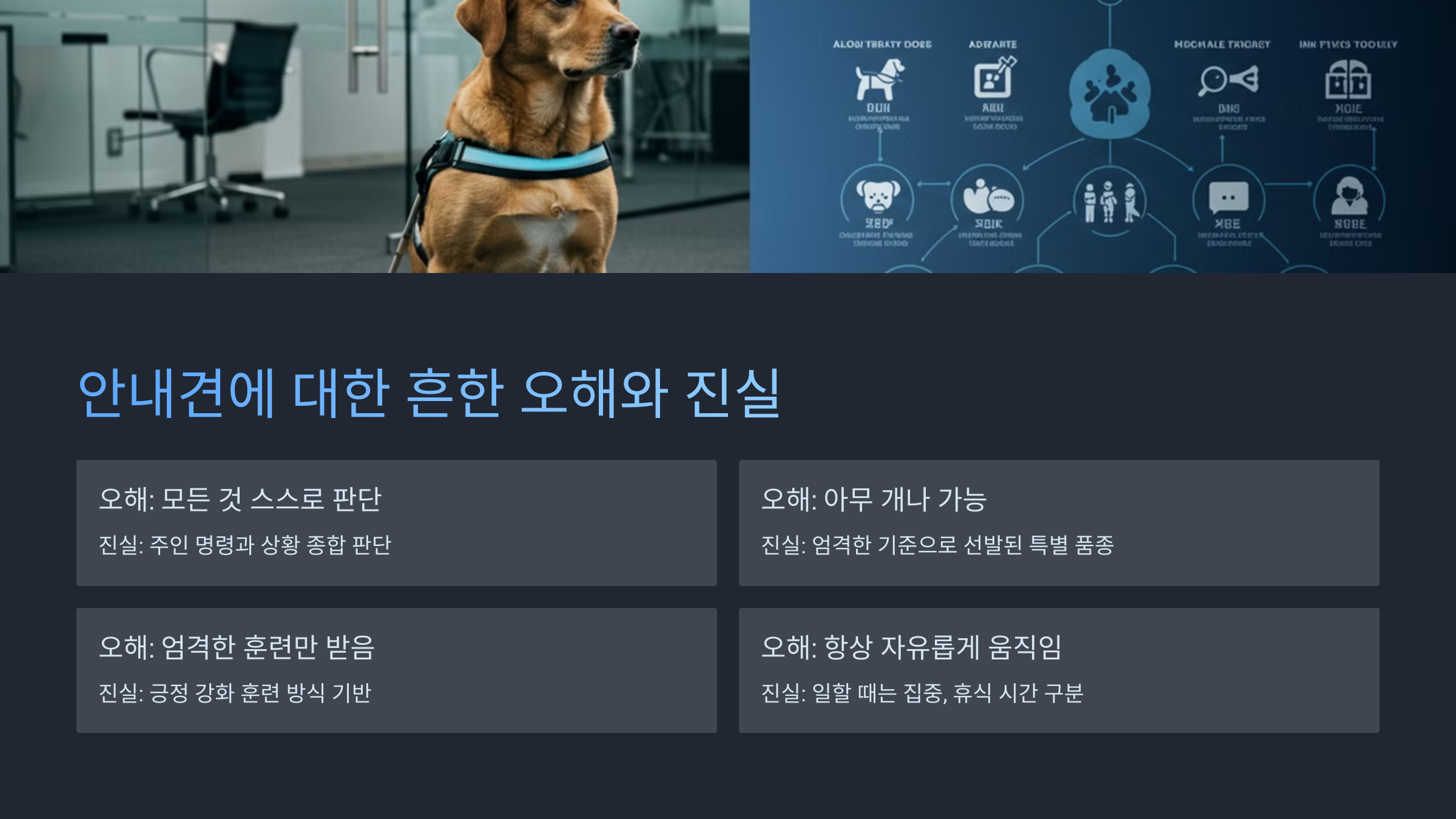 진실: 안내견은 주인의 명령과 주변 상황을 종합적으로 판단하여 움직입니다. 주인의 지시 없이는 스스로 판단하여 움직이지 않으며, 위험 상황을 감지하면 주인에게 알립니다. - 오해: 안내견은 아무나 될 수 있다?