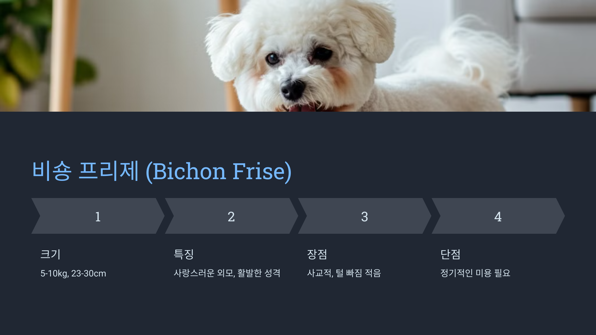 - 특징: 비숑 프리제는 사랑스러운 외모와 활발한 성격으로 가족과 잘 어울립니다. 이들은 털 빠짐이 적어 알레르기가 있는 가정에서도 기르기 좋습니다.