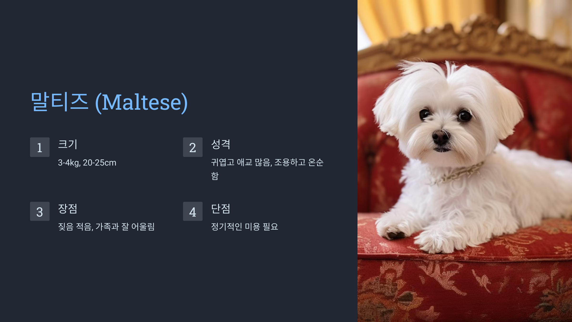 - 특징: 말티즈는 귀여운 외모와 애교가 많은 성격으로 유명합니다. 이들은 조용하고 온순하여 아파트 생활에 적합합니다. 털 관리가 필요하지만, 작은 체구 덕분에 공간을 많이 차지하지 않습니다.