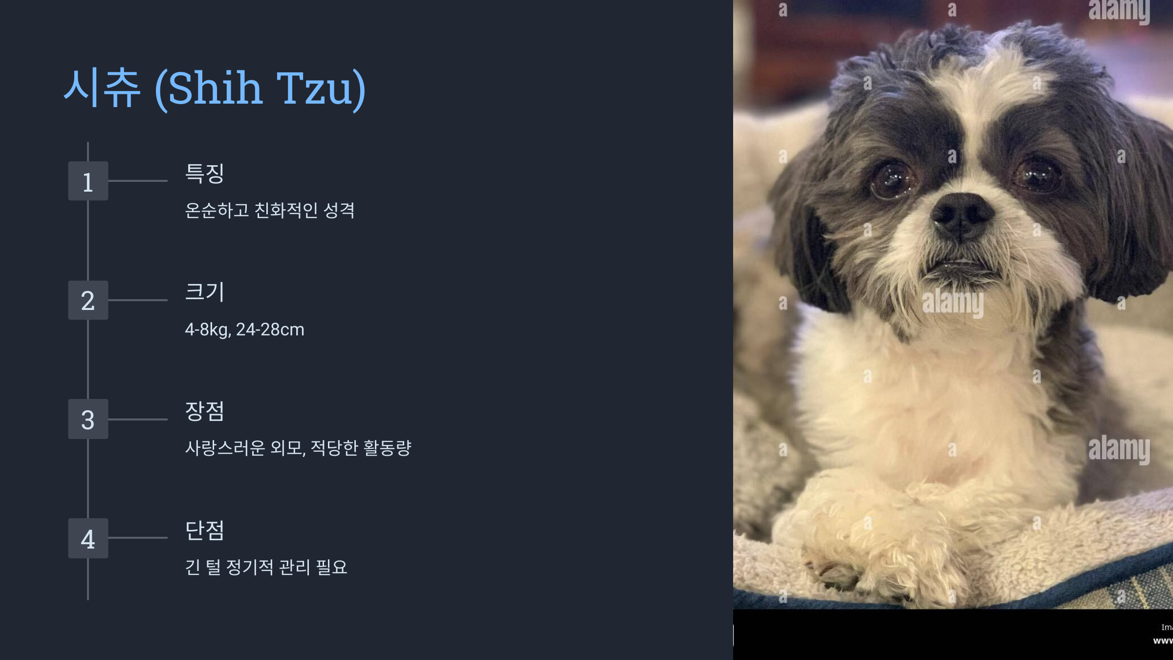 - 특징: 시츄는 온순하고 친화적인 성격으로, 가족과의 유대감을 중요시합니다. 이들은 작은 체구로 아파트 생활에 잘 어울리며, 짧은 산책으로도 충분한 운동을 할 수 있습니다.