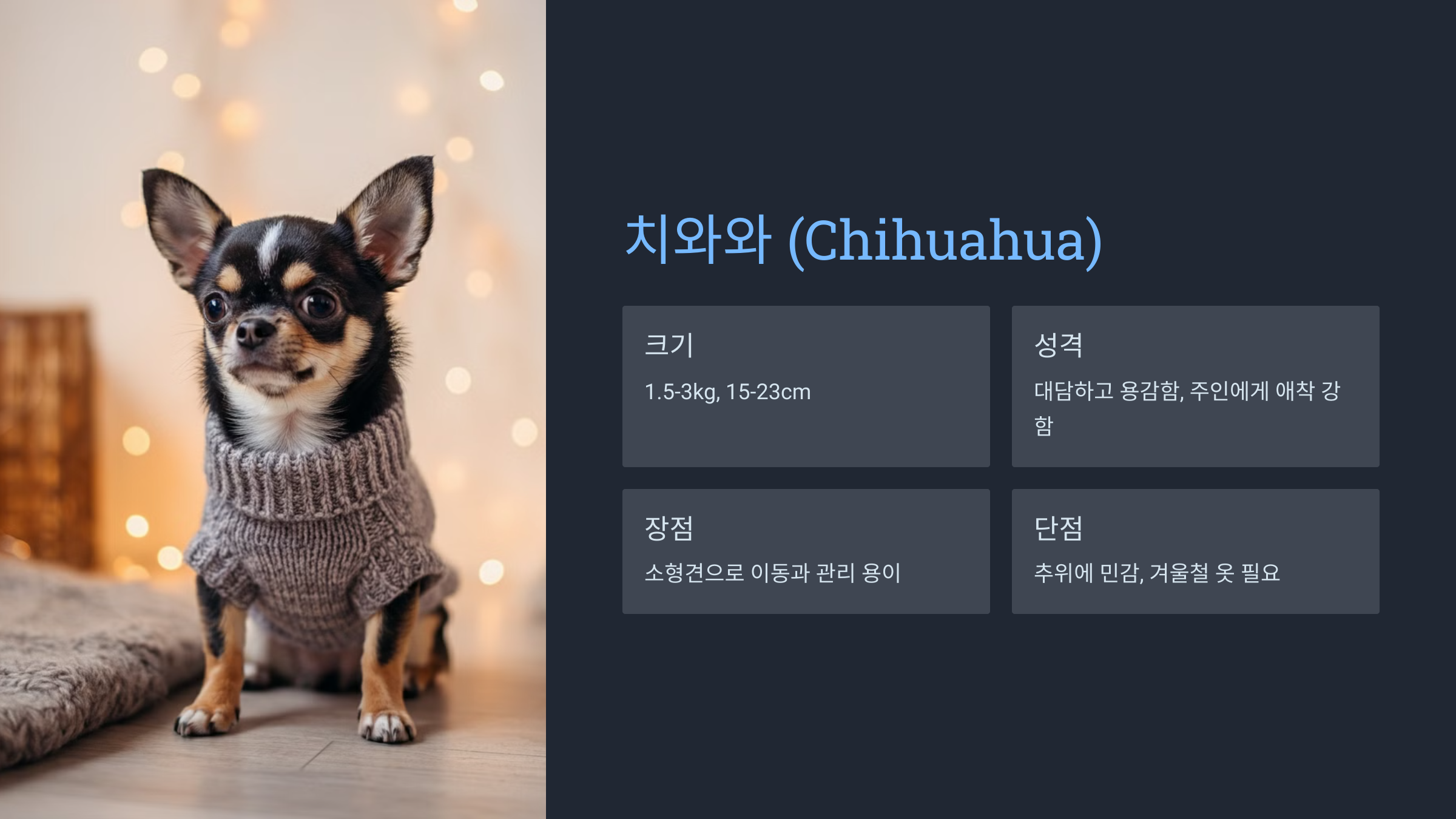 - 특징: 치와와는 세계에서 가장 작은 견종으로, 작은 공간에서도 잘 지낼 수 있습니다. 대담하고 용감한 성격을 가지고 있으며, 주인에게 매우 애착을 가집니다.