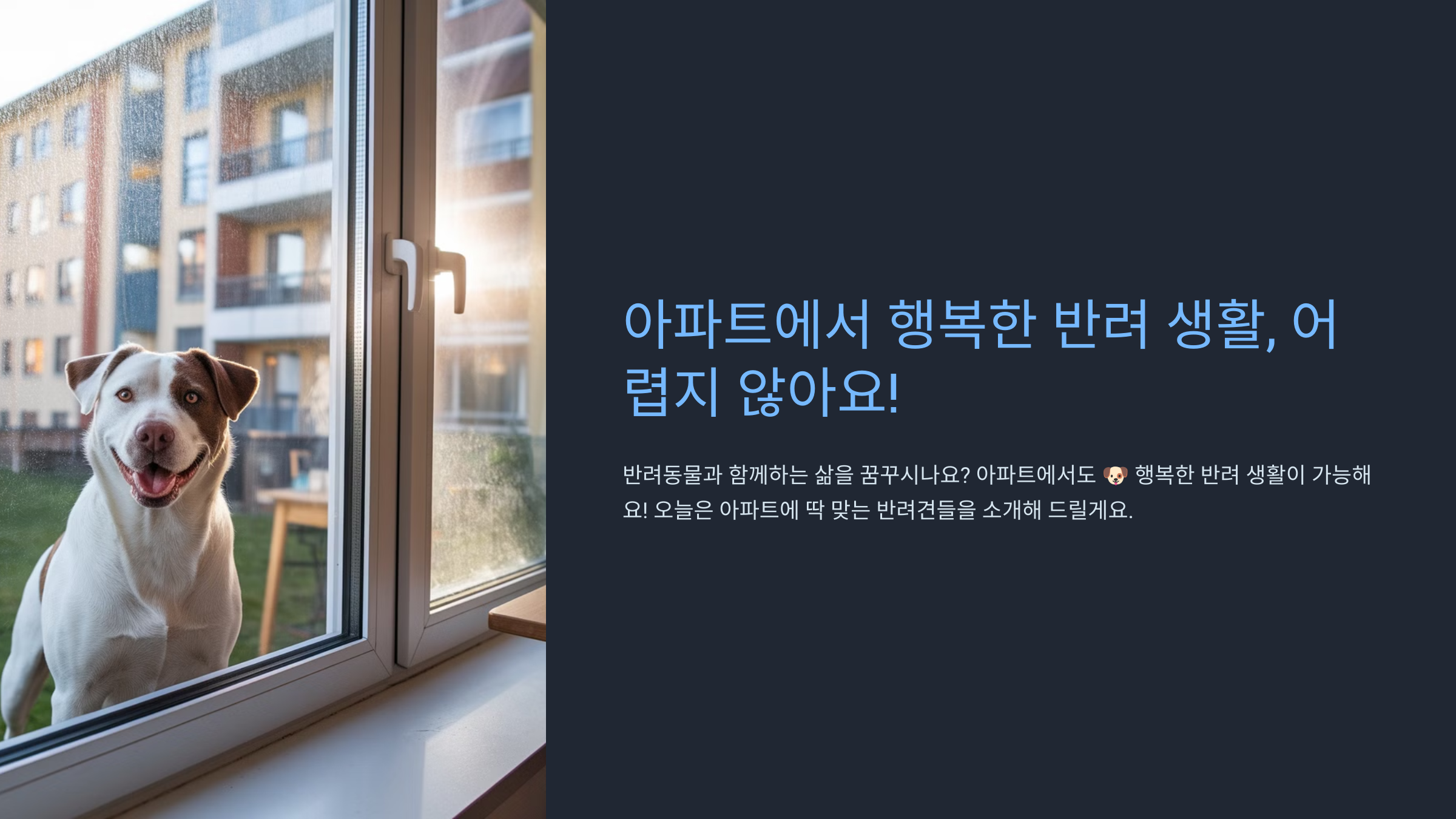 반려동물과 함께하는 삶을 꿈꾸시나요? 하지만 아파트에서 살고 계신다면 어떤 강아지를 키워야 할지 고민되실 거예요. 걱정 마세요! 아파트 생활에 잘 적응하고 키우기 쉬운 반려견들이 있답니다. 오늘은 아파트에서 키우기 좋은 강아지들을 소개해 드릴게요. 함께 알아보고, 여러분의 새로운 가족을 맞이할 준비를 해볼까요?