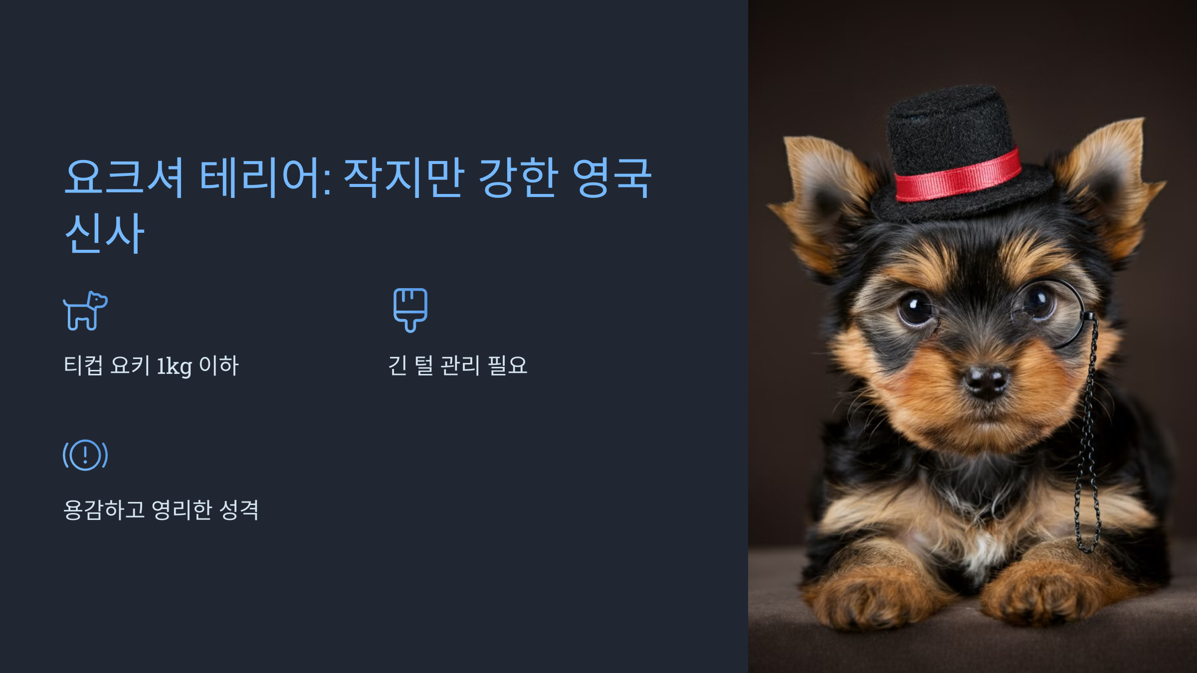 요크셔 테리어, 줄여서 '요키'라고 불리는 이 견종은 긴 털과 우아한 자태로 유명합니다.