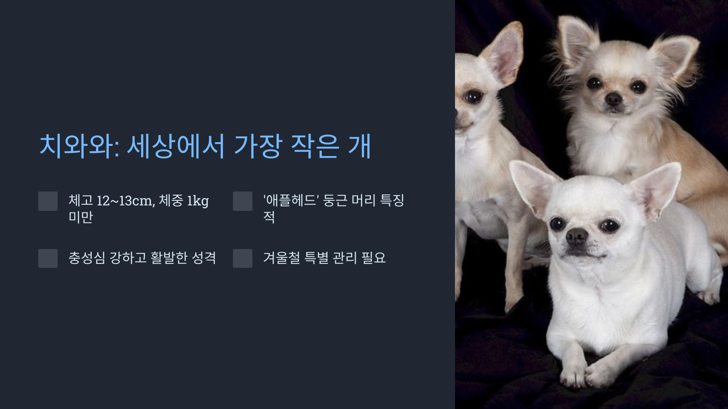 치와와는 1kg 이하 견종의 대표 주자입니다. 보통 체고가 12~13cm, 체중은 1kg 미만인 개체들이 많죠. 특히 '애플헤드'라 불리는 둥근 머리 모양이 특징적입니다.